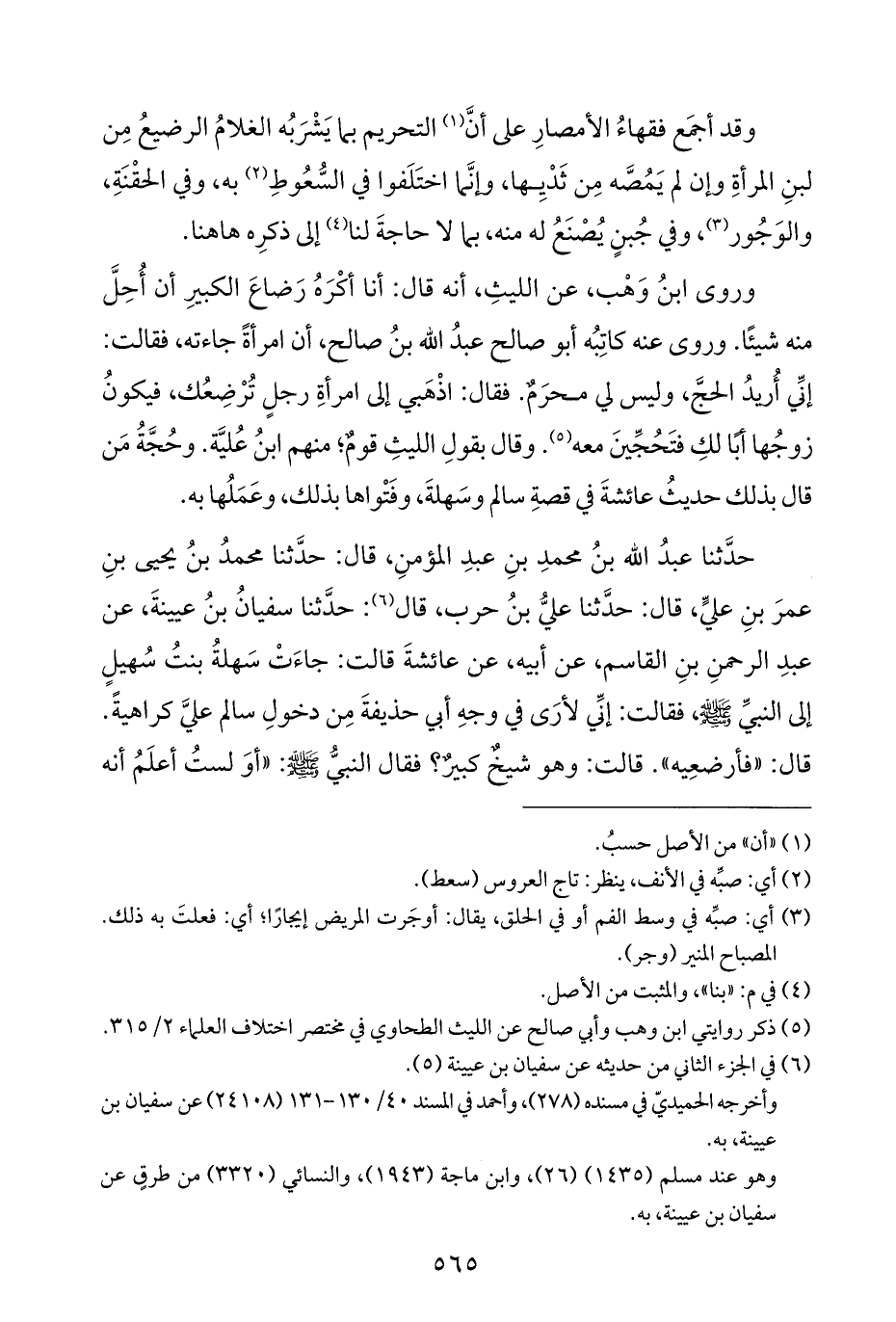 وروى ابنُ وَهْب، عن الليثِ، أنه قال: أنا أكْرَهُ رَضاعَ الكبيرِ أن أُحِلَّ منه شيئًا. وروى عنه كاتِبُه أبو صالح عبدُ الله بنُ صالح، أن امرأةً جاءته، فقالت: إنِّي أُريدُ الحجَّ، وليس لي محرَمٌ. فقال: اذْهَبي إلى امرأةِ رجلٍ تُرْضِعُك، فيكونُ زوجُها أبًا لكِ فتَحُجِّينَ معه (¬٥). وقال بقولِ الليثِ قومٌ؛ منهم ابنُ عُليَّة. وحُجَّةُ مَن قال بذلك حديثُ عائشةَ في قصةِ سالم وسَهلةَ، وفَتْواها بذلك، وعَمَلُها به.