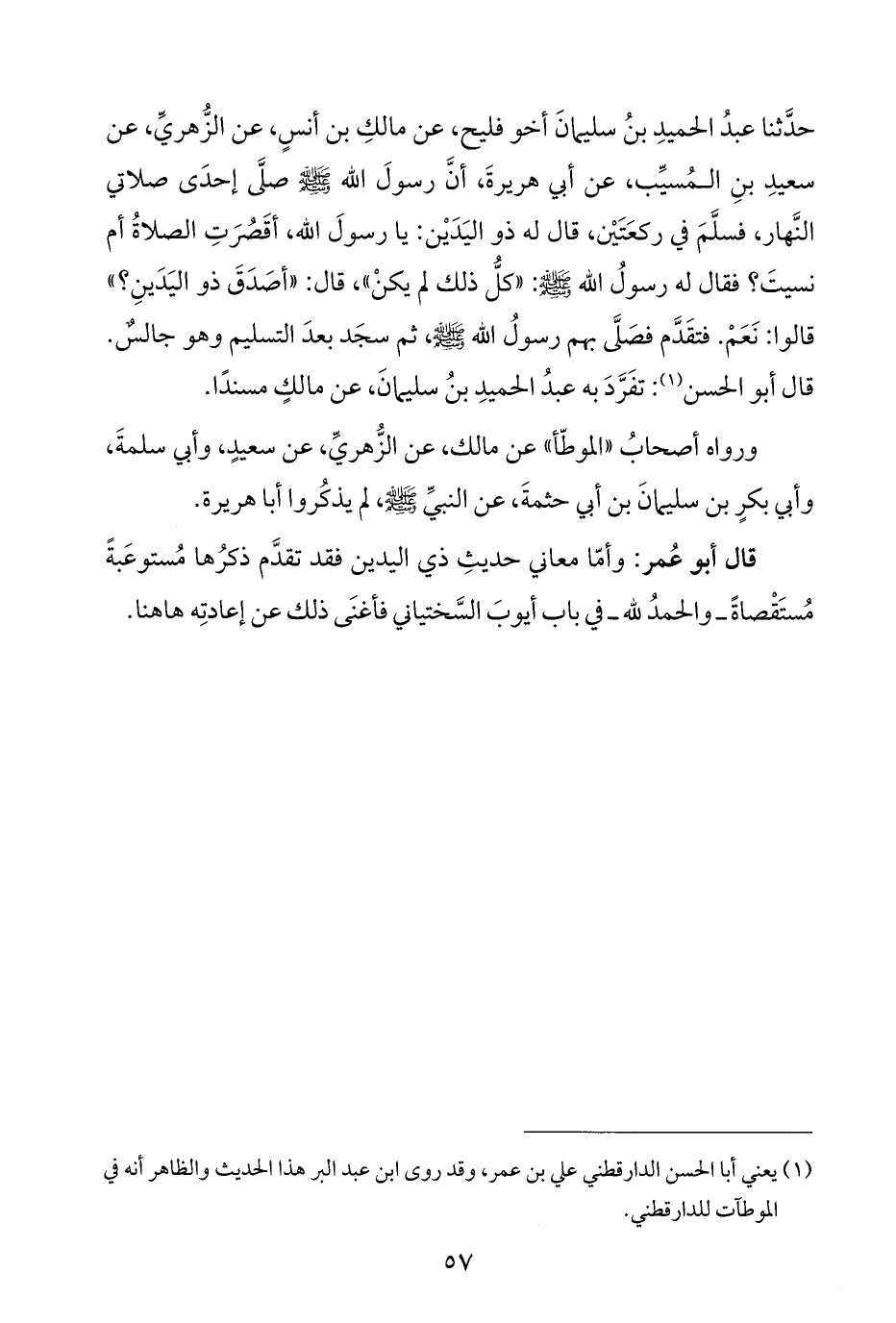 حدَّثنا عبدُ الحميدِ بنُ سليمانَ أخو فليح، عن مالكِ بن أنسٍ، عن الزُّهريِّ، عن سعيدِ بنِ المُسيِّب، عن أبي هريرةَ، أنَّ رسولَ الله - صلى الله عليه وسلم - صلَّى إحدَى صلاتي النَّهار، فسلَّمَ في ركعَتَيْن، قال له ذو اليَدَيْن: يا رسولَ الله، أقَصرَتِ الصلاةُ أم نسيتَ؟ فقال له رسولُ الله - صلى الله عليه وسلم -: "كلُّ ذلك لم يكنْ"، قال: "أصَدَقَ ذو اليَدَينِ؟ " قالوا: نَعَمْ. فتقَدَّم فصَلَّى بهم رسولُ الله - صلى الله عليه وسلم -، ثم سجَد بعدَ التسليم وهو جالسٌ. قال أبو الحسن (¬١): تفَرَّدَ به عبدُ الحميدِ بنُ سليمانَ، عن مالكٍ مسندًا.