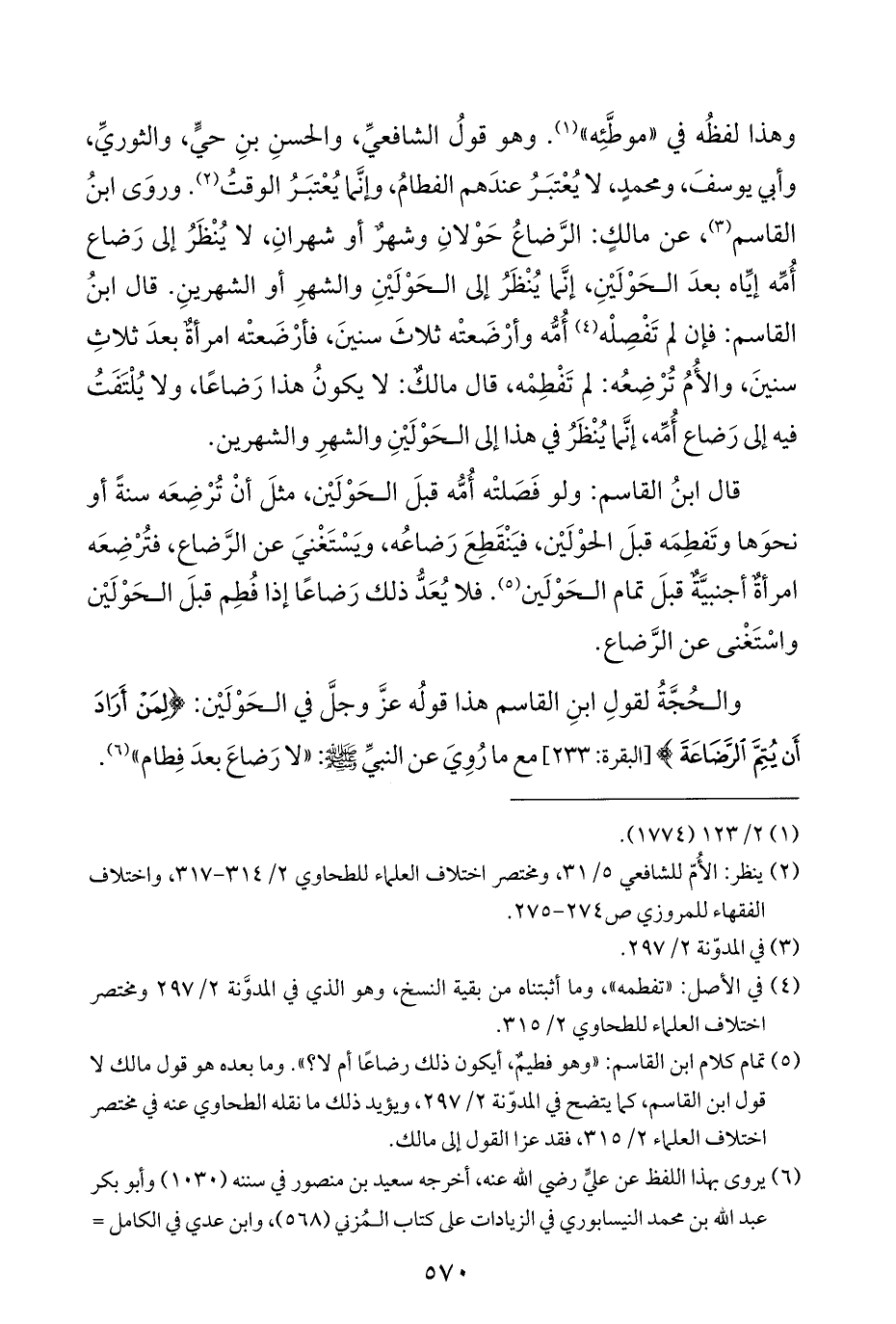 (¬٥) تمام كلام ابن القاسم: "وهو فطيمٌ، أيكون ذلك رضاعًا أم لا؟ ". وما بعده هو قول مالك لا قول ابن القاسم، كما يتضح في المدوّنة ٢/ ٢٩٧، ويؤيد ذلك ما نقله الطحاوي عنه في مختصر اختلاف العلماء ٢/ ٣١٥، فقد عزا القول إلى مالك.