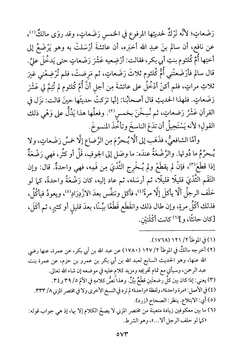 رَضَعاتٍ؛ لأنَّه تَرْكٌ لحديثها المرفوع في الخمسِ رَضَعاتٍ، وقد روَى مالكٌ (¬١)، عن نافع، أن سالم بنَ عبدِ الله أخبَره، أن عائشةَ أرْسَلتْ به وهو يَرْضَعُ إلى أختِها أُمِّ كُلثوم بنتِ أبي بكر، فقالت: أرْضِعيه عَشْرَ رَضَعاتٍ حتى يَدخُلَ عليَّ. قال سالم فأرْضَعتْني أُمُّ كُلثوم ثلاثَ رَضَعاتٍ، ثم مَرِضتْ، فلم تُرْضِعْني غيرَ ثلاثِ مراتٍ، فلم أكنْ أدْخُلُ على عائشةَ مِن أجلِ أنَّ أُمَّ كُلثوم لم تُتِمَّ لي عَشْرَ رَضَعاتٍ. فلهذا الحديثِ قال أصحابُنا: إنَّها ترَكتْ حديثَها حينَ قالت: نزَل في القرآنِ عَشْرُ رَضعاتٍ، ثم نُسِخْنَ بخمسٍ (¬٢). وفعلُها هذا يَدُلُّ على وَهْي ذلك القولِ؛ لأنه يَسْتَحِيلُ أن تدَعَ الناسخَ وتأخُذَ المنسوخَ.