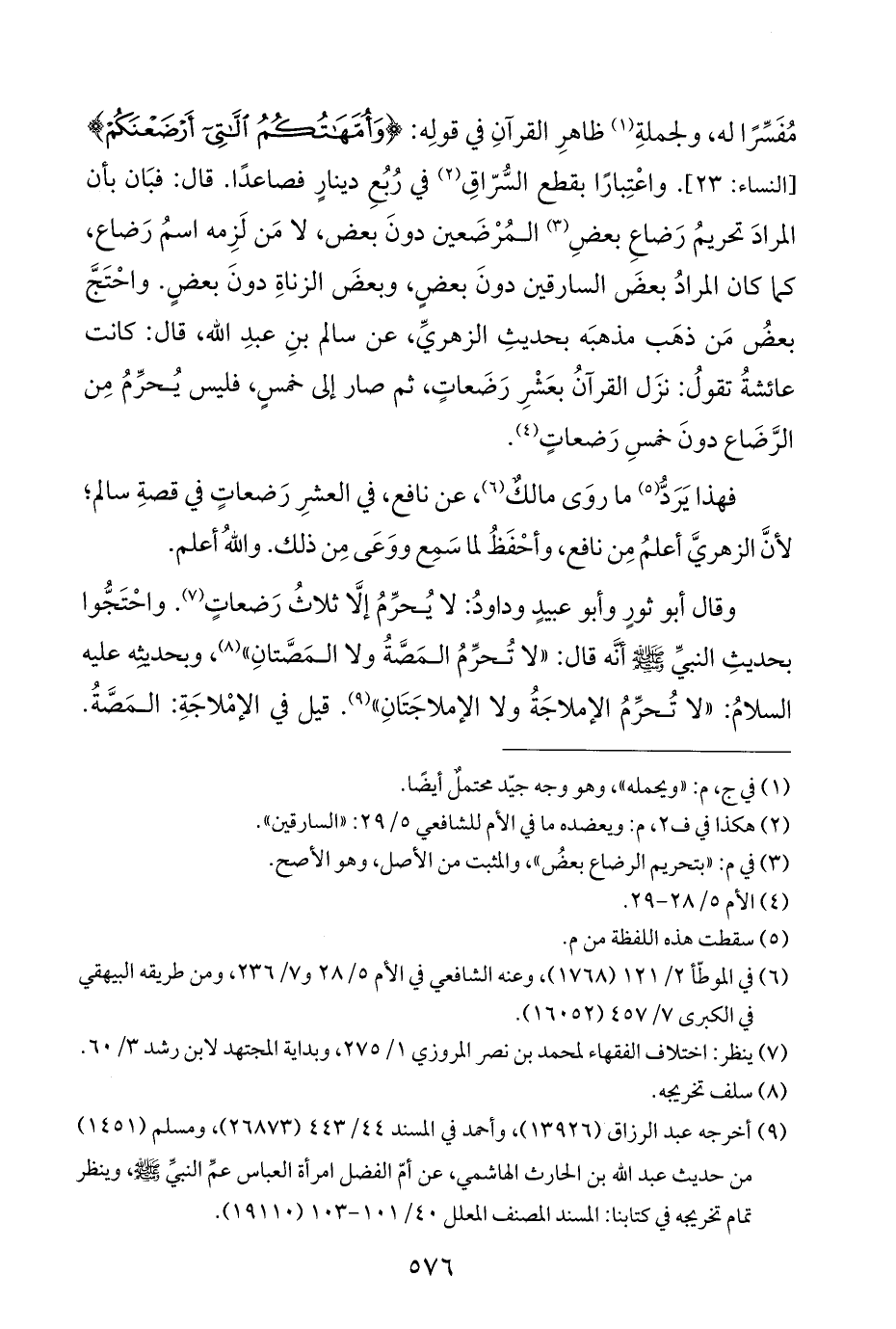 مُفَسِّرًا له، ولجملةِ (¬١) ظاهرِ القرآنِ في قولِه: {وَأُمَّهَاتُكُمُ اللَّاتِي أَرْضَعْنَكُمْ} [النساء: ٢٣]. واعْتِبارًا بقطع السُّرّاقِ (¬٢) في رُبُعِ دينارٍ فصاعدًا. قال: فبَان بأن المرادَ تحريمُ رَضاعِ بعضِ (¬٣) المُرْضَعين دونَ بعض، لا مَن لَزِمه اسمُ رَضاع، كما كان المرادُ بعضَ السارقين دونَ بعضٍ، وبعضَ الزناةِ دونَ بعضٍ. واحْتَجَّ بعضُ مَن ذهَب مذهبَه بحديثِ الزهريِّ، عن سالم بنِ عبدِ الله، قال: كانت عائشةُ تقولُ: نزَل القرآنُ بعَشْرِ رَضَعاتٍ، ثم صار إلى خمسٍ، فليس يُحرِّمُ مِن الرَّضَاع دونَ خمسِ رَضعاتٍ (¬٤).