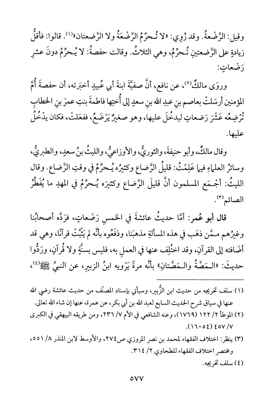 قال أبو عُمر: أمَّا حديثُ عائشةَ في الخمسِ رَضَعاتٍ، فرَدَّه أصحابُنا وغيرُهم ممَّن ذهَب في هذه المسألةِ مذهبَنا، ودَفَعُوه بأنه لم يَثْبُتْ قرآنًا، وهي قد أضَافته إلى القرآنِ، وقد اختُلِف عنها في العملِ به، فليس بسنَّةٍ ولا قُرآنٍ، ورَدُّوا حديثَ: "المَصَّةُ والمَصَّتانِ" بأنَّه مرةً يَرْويه ابنُ الزبيرِ، عن النبيِّ - صلى الله عليه وسلم - (¬٤)،