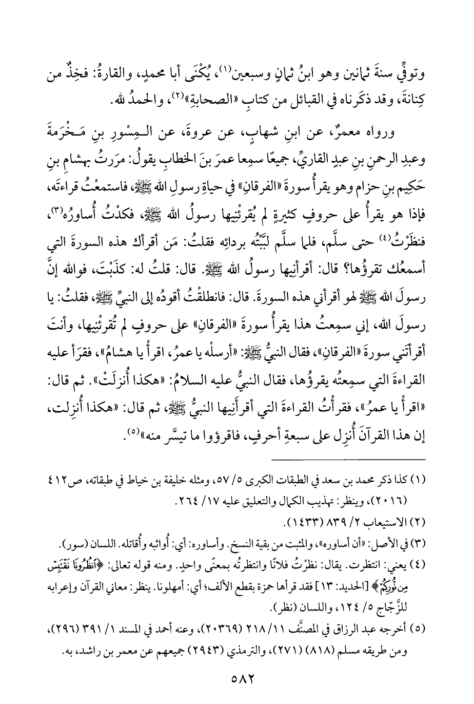ورواه معمرٌ، عن ابنِ شهابٍ، عن عروةَ، عن المِسْورِ بنِ مَخْرَمةَ وعبدِ الرحمنِ بنِ عبدٍ القاريِّ، جميعًا سمِعا عمرَ بنَ الخطابِ يقولُ: مرَرتُ بهشامِ بنِ حَكِيم بنِ حزام وهو يقرأُ سورةَ "الفرقانِ" في حياةِ رسولِ الله - صلى الله عليه وسلم -، فاستمعْتُ قراءتَه، فإذا هو يقرأُ على حروفٍ كثيرةٍ لم يُقرئْنِيها رسولُ الله - صلى الله عليه وسلم -، فكدْتُ أُساورُه (¬٣)، فنظَرْتُ (¬٤) حتى سلَّم، فلما سلَّم لبَّبْتُه بردائِه فقلتُ: مَن أقرأك هذه السورةَ التي أسمعُك تقرؤُها؟ قال: أقرأنِيها رسولُ الله - صلى الله عليه وسلم -. قال: قلتُ له: كذَبْتَ، فوالله إنَّ رسولَ الله - صلى الله عليه وسلم - لهو أقرأني هذه السورةَ. قال: فانطلقْتُ أقودُه إلى النبيِّ - صلى الله عليه وسلم -، فقلتُ: يا رسولَ الله، إني سمِعتُ هذا يقرأُ سورةَ "الفرقانِ" على حروفٍ لم تُقرئْنِيها، وأنتَ أقرأتَني في سورةَ "الفرقانِ"، فقال النبيُّ - صلى الله عليه وسلم -: "أرسلْه يا عمرُ، اقرأْ يا هشامُ"، فقرَأ عليه القراءةَ التي سمِعتُه يقرؤُها، فقال النبيُّ عليه السلامُ: "هكذا أُنزلَتْ". ثم قال: "اقرأْ يا عمرُ"، فقرأْتُ القراءةَ التي أقرأَنِيها النبيُّ - صلى الله عليه وسلم -، ثم قال: "هكذا أُنزِلت، إن هذا القرآنَ أُنزِل على سبعةِ أحرفٍ، فاقرؤوا ما تيسَّر منه" (¬٥).