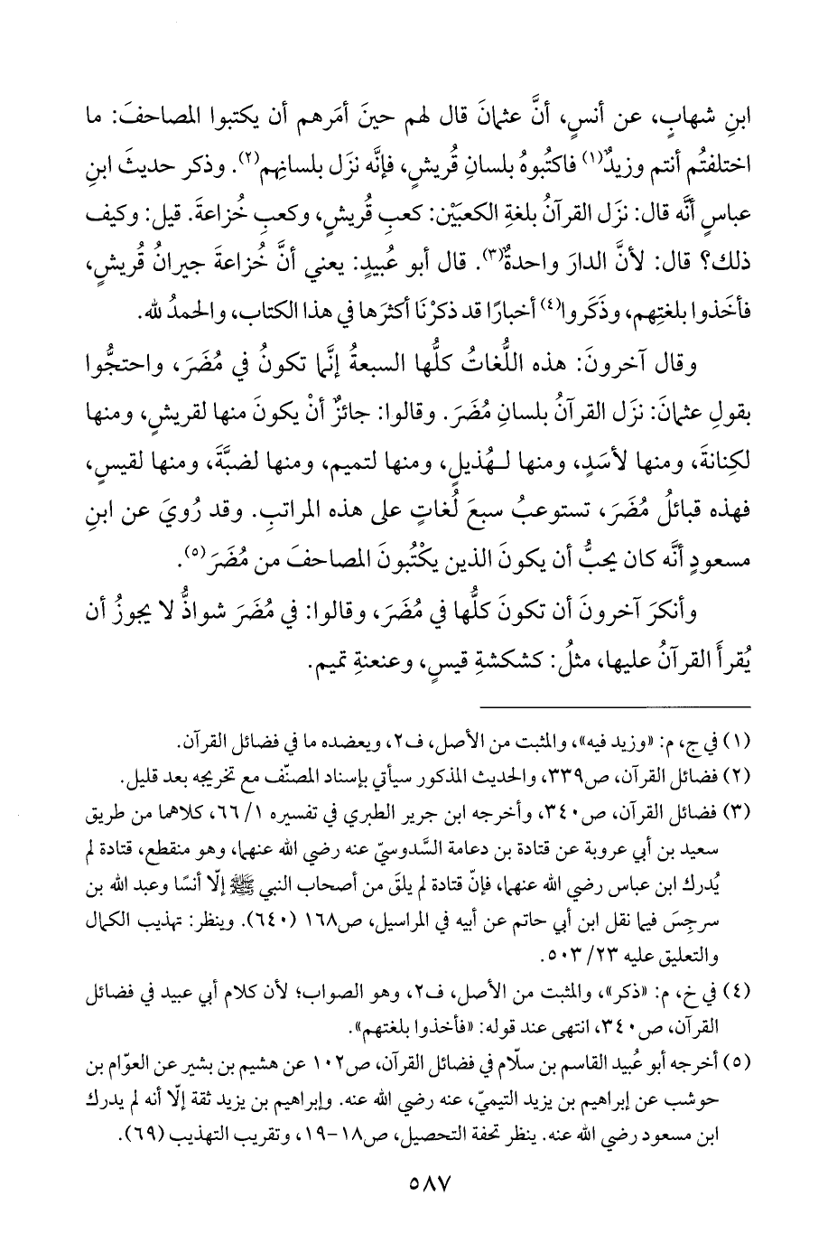 ابنِ شهابٍ، عن أنسٍ، أنَّ عثمانَ قال لهم حينَ أمَرهم أن يكتبوا المصاحفَ: ما اختلفتُم أنتم وزيدٌ (¬١) فاكتُبوهُ بلسانِ قُريشٍ، فإنَّه نزَل بلسانِهم (¬٢). وذكر حديثَ ابنِ عباسٍ أنَّه قال: نزَل القرآنُ بلغةِ الكعبَيْن: كعبِ قُريشٍ، وكعبِ خُزاعةَ. قيل: وكيف ذلك؟ قال: لأنَّ الدارَ واحدةٌ (¬٣). قال أبو عُبيدٍ: يعني أنَّ خُزاعةَ جيرانُ قُريشٍ، فأخَذوا بلغتِهم، وذَكَروا (¬٤) أخبارًا قد ذكرْنَا أكثرَها في هذا الكتاب، والحمدُ للّه.