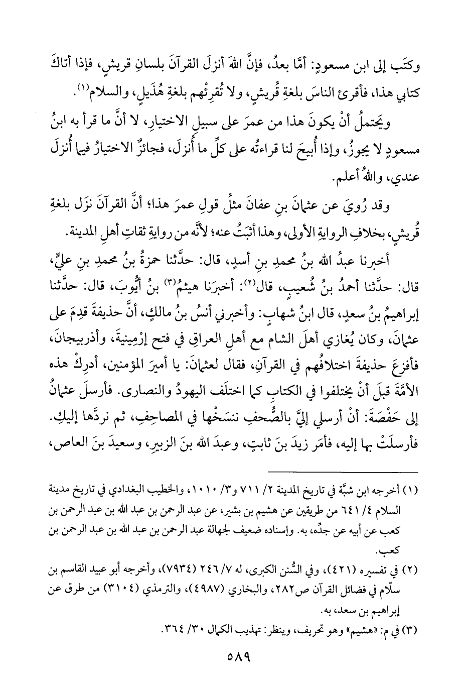 وقد رُويَ عن عثمانَ بنِ عفانَ مثلُ قولِ عمرَ هذا؛ أنَّ القرآنَ نزَل بلغةِ قُريشٍ، بخلافِ الروايةِ الأولى، وهذا أثبَتُ عنه؛ لأنَّه من روايةِ ثقاتِ أهلِ المدينة.