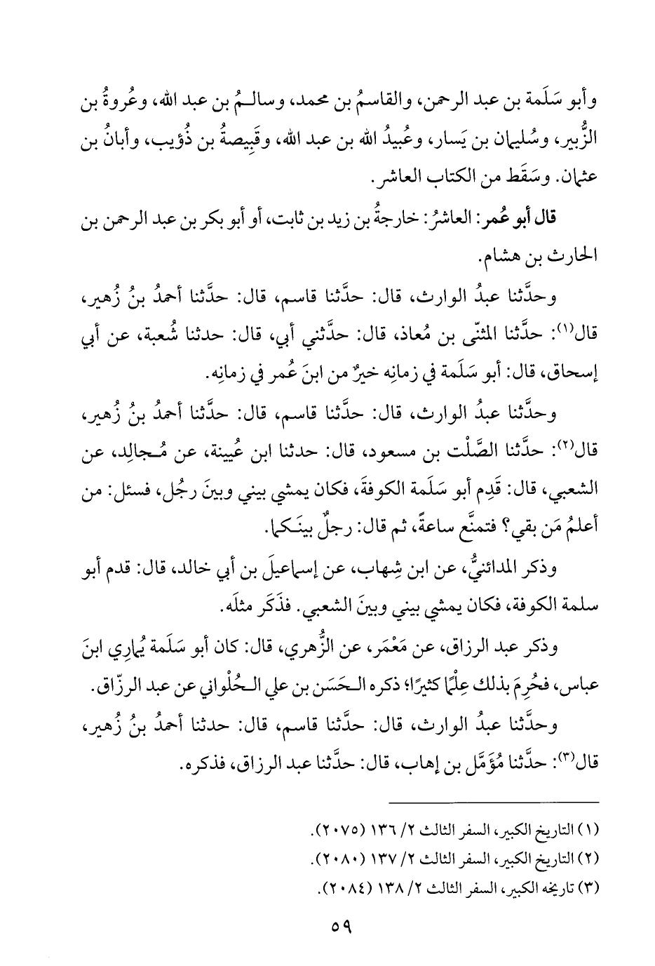 وحدَّثنا عبدُ الوارث، قال: حدَّثنا قاسم، قال: حدَّثنا أحمدُ بنُ زُهير، قال (¬١): حدَّثنا المثنّى بن مُعاذ، قال: حدَّثني أبي، قال: حدثنا شُعبة، عن أبي إسحاق، قال: أبو سَلَمة في زمانِه خيرٌ من ابنَ عُمر في زمانِه.