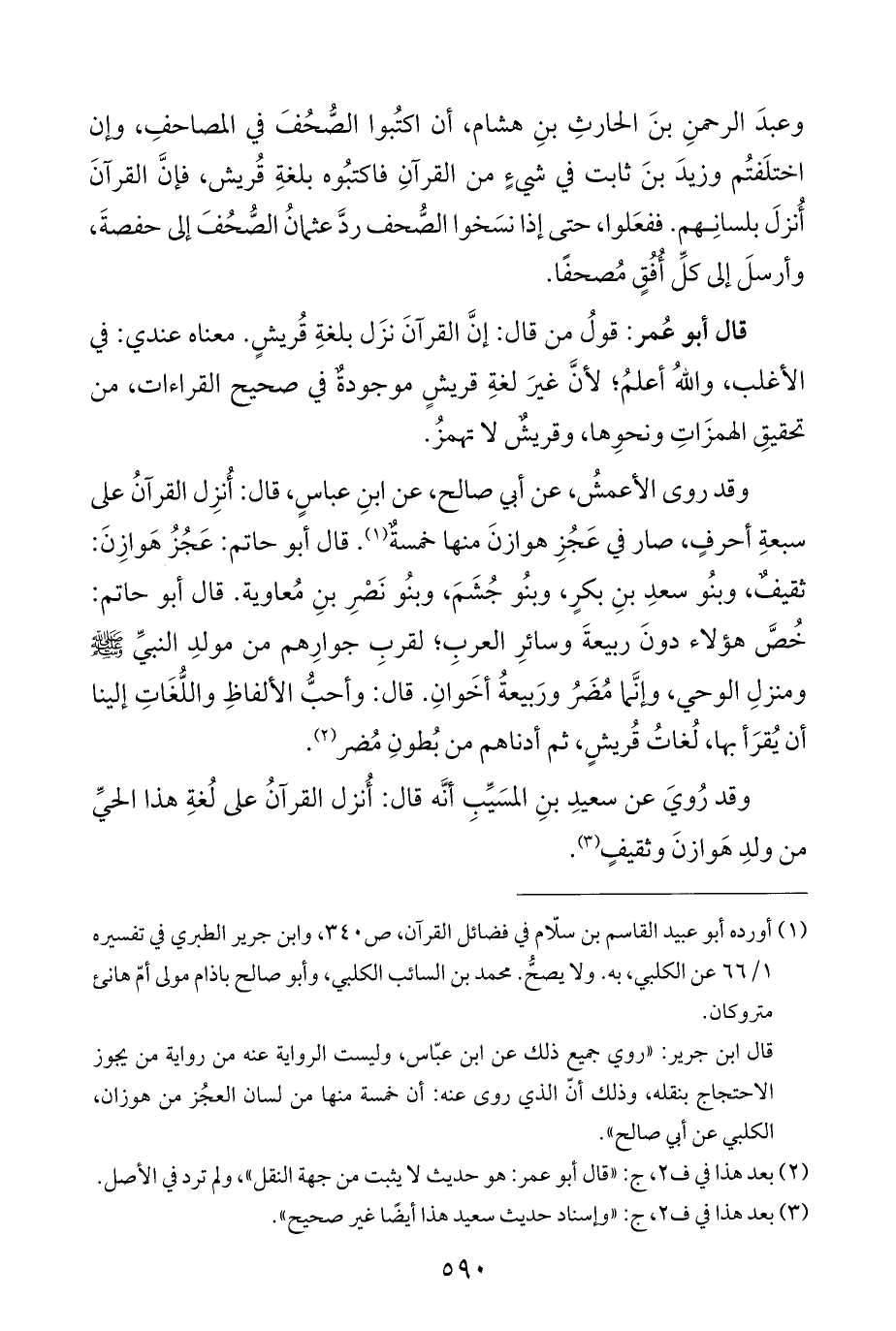وقد روى الأعمشُ، عن أبي صالح، عن ابنِ عباسٍ، قال: أُنزِل القرآنُ على سبعةِ أحرفٍ، صار في عَجُزِ هوازنَ منها خمسةٌ (¬١). قال أبو حاتم: عَجُزُ هَوازِنَ: ثقيفٌ، وبنُو سعدِ بنِ بكرٍ، وبنُو جُشَمَ، وبنُو نَصْرِ بنِ مُعاوية. قال أبو حاتم: خُصَّ هؤلاء دونَ ربيعةَ وسائرِ العربِ؛ لقربِ جوارِهم من مولدِ النبيِّ - صلى الله عليه وسلم - ومنزلِ الوحي، وإنَّما مُضَرُ ورَبيعةُ أخَوانِ. قال: وأحبُّ الألفاظِ واللُّغَاتِ إلينا أن يُقرَأ بها، لُغاتُ قُريشٍ، ثم أدناهم من بُطونِ مُضر (¬٢).