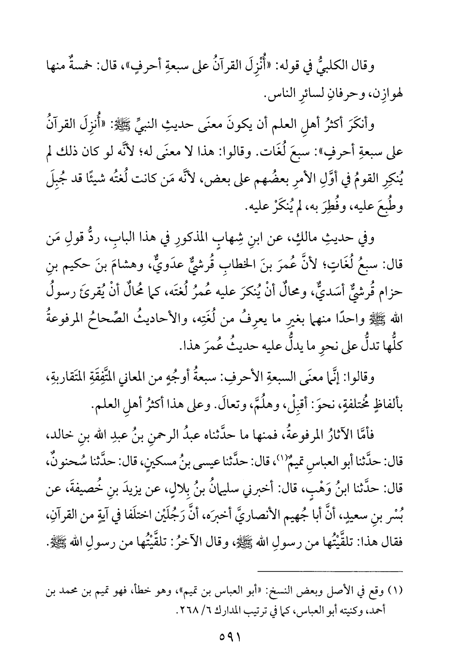 وأنكَرَ أكثرُ أهلِ العلم أن يكونَ معنَى حديثِ النبيِّ - صلى الله عليه وسلم -: "أُنزِلَ القرآنُ على سبعةِ أحرفٍ": سبعَ لُغَات. وقالوا: هذا لا معنَى له؛ لأنَّه لو كان ذلك لم يُنكِرِ القومُ في أوَّلِ الأمرِ بعضُهم على بعض، لأنَّه مَن كانت لُغتُه شيئًا قد جُبِلَ وطُبعَ عليه، وفُطِرَ به، لم يُنكَرْ عليه.