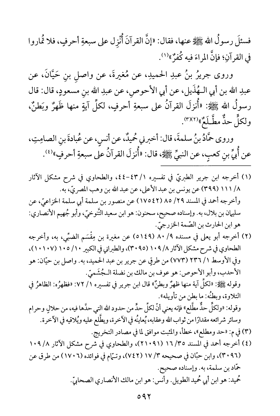 وروى جريرُ بنُ عبدِ الحميدِ، عن مُغيرةَ، عن واصلِ بنِ حَيَّانَ، عن عبدِ الله بن أبي الهُذَيل، عن أبي الأحوصِ، عن عبدِ الله بنِ مسعودٍ، قال: قال رسولُ الله - صلى الله عليه وسلم -: "أُنزلَ القرآنُ على سبعةِ أحرفٍ، لكلِّ آيةٍ منها ظَهرٌ وبَطنٌ، ولكلٍّ حدٌّ مطَّلَعٌ" (¬٢) (¬٣).