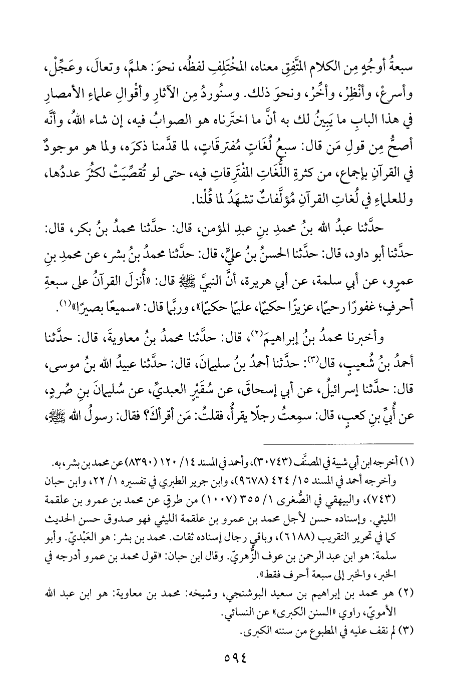 (¬١) أخرجه ابن أبي شيبة في المصنَّف (٣٠٧٤٣)، وأحمد في المسند ١٤/ ١٢٠ (٨٣٩٠) عن محمد بن بشر، به. وأخرجه أحمد في المسند ١٥/ ٤٢٤ (٩٦٧٨)، وابن جرير الطبري في تفسيره ١/ ٢٢، وابن حبان (٧٤٣)، والبيهقي في الصُّغرى ١/ ٣٥٥ (١٠٠٧) من طرقٍ عن محمد بن عمرو بن علقمة الليثي. وإسناده حسن لأجل محمد بن عمرو بن علقمة الليثي فهو صدوق حسن الحديث كما في تحرير التقريب (٦١٨٨)، وباقي رجال إسناده ثقات. محمد بن بشر: هو العَبْديّ. وأبو سلمة: هو ابن عبد الرحمن بن عوف الزّهريّ. وقال ابن حبان: "قول محمد بن عمرو أدرجه في الخبر، والخبر إلى سبعة أحرف فقط".