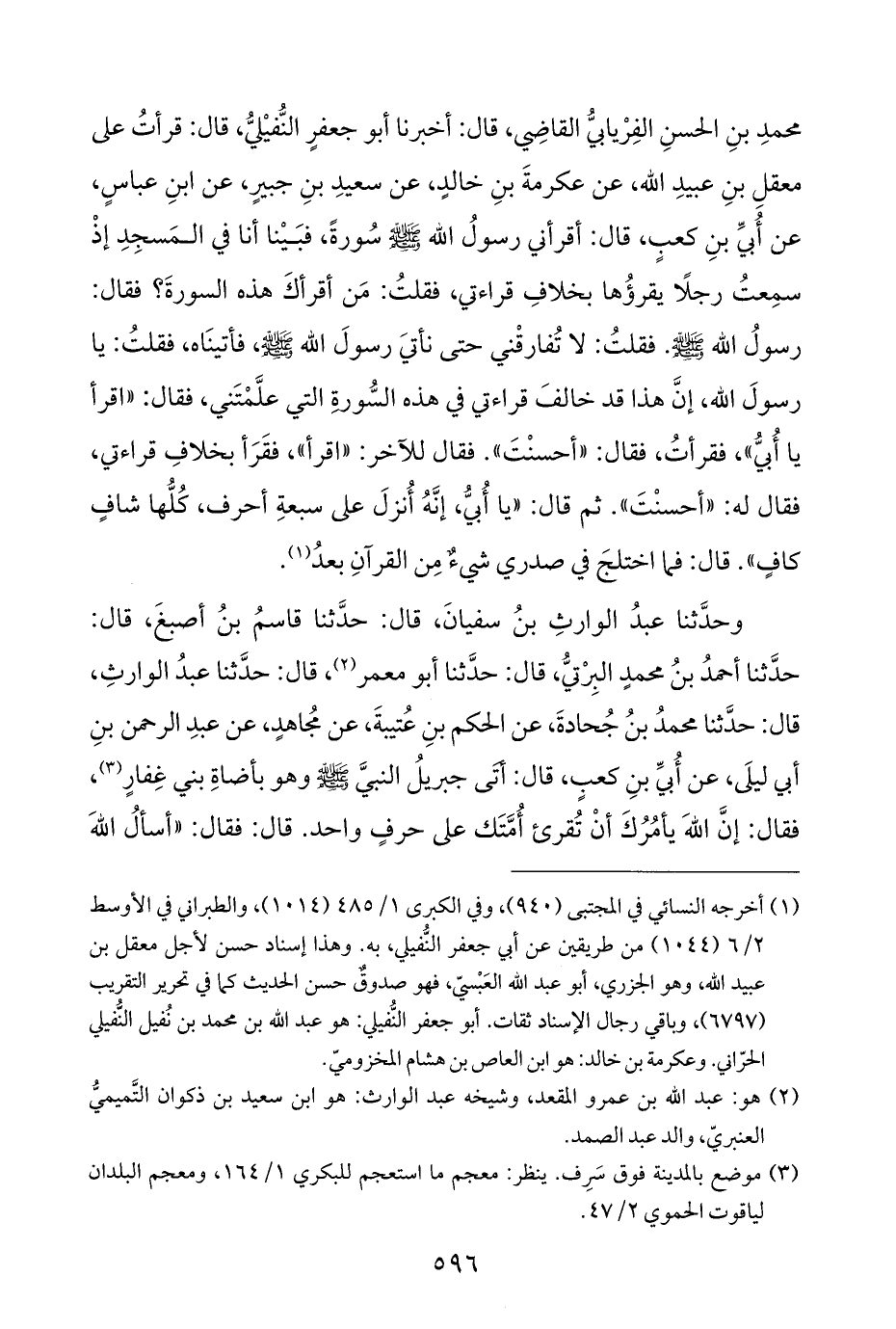 محمدِ بنِ الحسنِ الفِرْيابيُّ القاضِي، قال: أخبرنا أبو جعفرٍ النُّفيْليُّ، قال: قرأتُ على معقلِ بنِ عبيدِ الله، عن عكرمةَ بنِ خالدٍ، عن سعيدِ بنِ جبيرٍ، عن ابنِ عباسٍ، عن أُبيِّ بنِ كعبٍ، قال: أقرأني رسولُ الله - صلى الله عليه وسلم - سُورةً، فبَيْنا أنا في المَسجِدِ إذْ سمِعتُ رجلًا يقرؤُها بخلافِ قراءتي، فقلتُ: مَن أقرأكَ هذه السورةَ؟ فقال: رسولُ الله - صلى الله عليه وسلم -. فقلتُ: لا تُفارقْني حتى نأتيَ رسولَ الله - صلى الله عليه وسلم -، فأتينَاه، فقلتُ: يا رسولَ الله، إنَّ هذا قد خالفَ قراءتي في هذه السُّورةِ التي علَّمْتَني، فقال: "اقرأ يا أُبيُّ"، فقرأتُ، فقال: "أحسنْتَ". فقال للآخر: "اقرأ"، فقَرَأ بخلافِ قراءتي، فقال له: "أحسنْتَ". ثم قال: "يا أُبيُّ، إنَّهُ أُنزلَ على سبعةِ أحرف، كُلُّها شافٍ كافٍ". قال: فما اختلجَ في صدري شيءٌ مِن القرآنِ بعدُ (¬١).