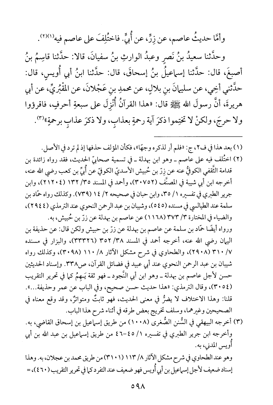 (¬٢) اختُلف فيه على عاصم - وهو ابن بهدلة - في تسمية صحابيّ الحديث، فقد رواه زائدة بن قدامة الثَّقفي الكوفيُّ عنه عن زِرّ بن حُبيش الأسديّ الكوفيّ عن أُبيِّ بن كعب - رضي الله عنه -، أخرجه ابن أبي شيبة في المصنَّف (٣٠٧٥٢)، وأحمد في المسند ٣٥/ ١٣٢ (٢١٢٠٤)، وابن جرير الطبري في تفسيره ١/ ٣٥، وابن حبان في صحيحه ٢/ ١٤ (٧٣٩). وكذلك رواه حمّاد بن سلمة عند الطيالسي في مسنده (٥٤٥)، وشيبان بن عبد الرحمن النحوي عند الترمذي (٢٩٤٤)، والضياء في المختارة ٣/ ٣٧٣ (١١٦٨) عن عاصم بن بهدلة عن زرّ بن حُبيش، به.