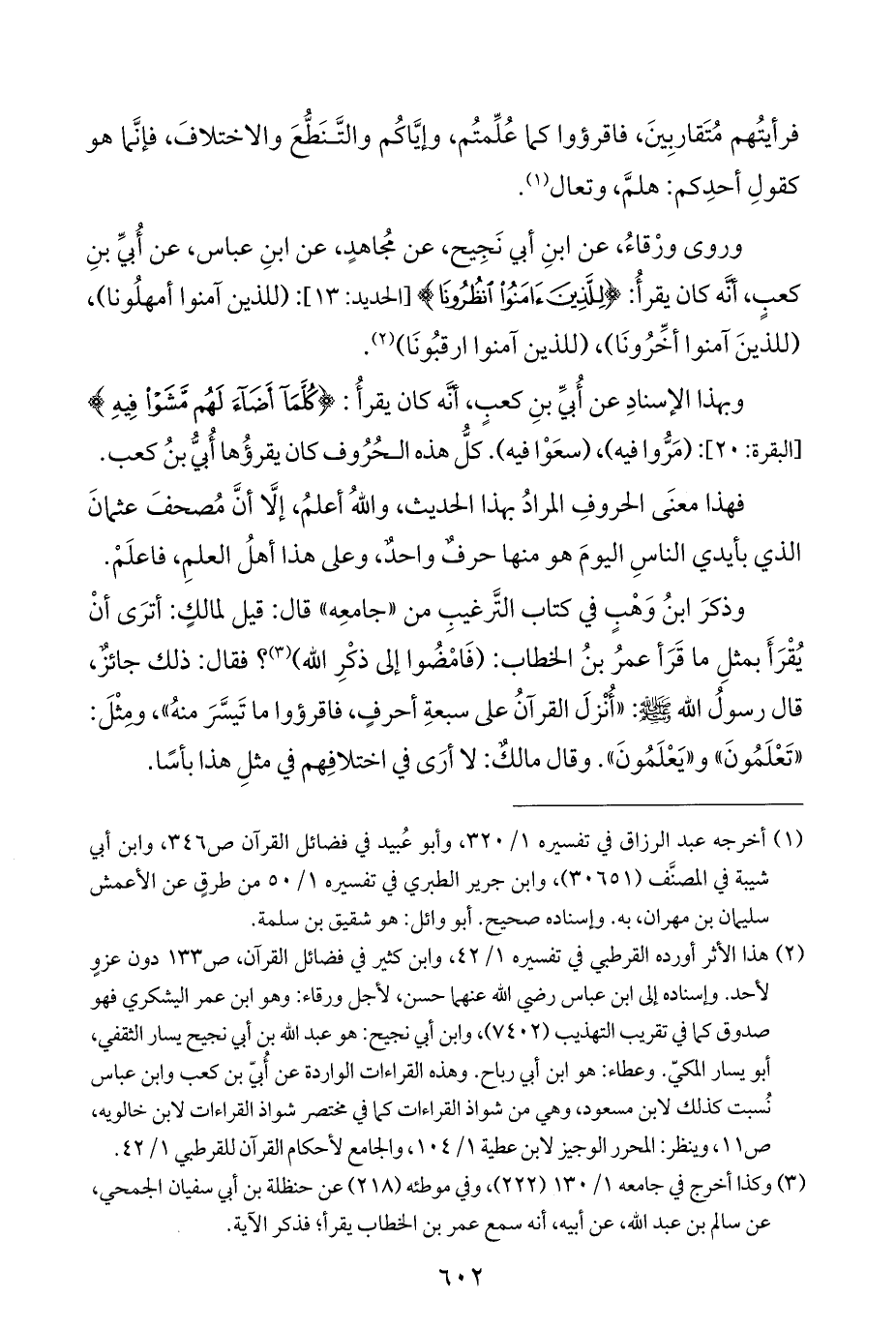 فهذا معنَى الحروفِ المرادُ بهذا الحديث، واللّهُ أعلمُ، إلَّا أنَّ مُصحفَ عثمانَ الذي بأيدي الناسِ اليومَ هو منها حرفٌ واحدٌ، وعلى هذا أهلُ العلمِ، فاعلَمْ.