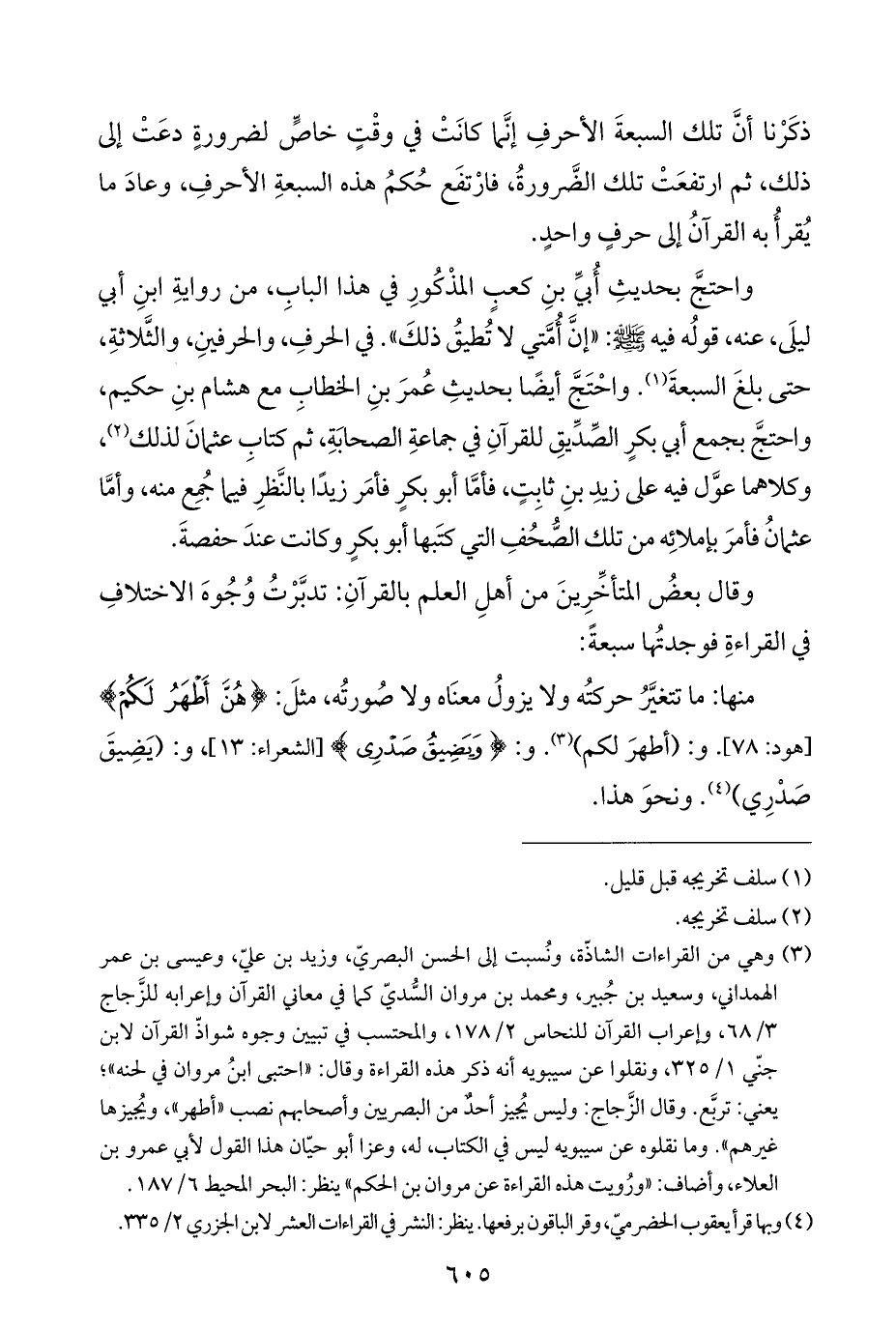 ذكَرْنا أنَّ تلك السبعةَ الأحرفِ إنَّما كانَتْ في وقْتٍ خاصٍّ لضرورةٍ دعَتْ إلى ذلك، ثم ارتفعَتْ تلك الضَّرورةُ، فارْتفَع حُكمُ هذه السبعةِ الأحرفِ، وعادَ ما يُقرأُ به القرآنُ إلى حرفٍ واحدٍ.