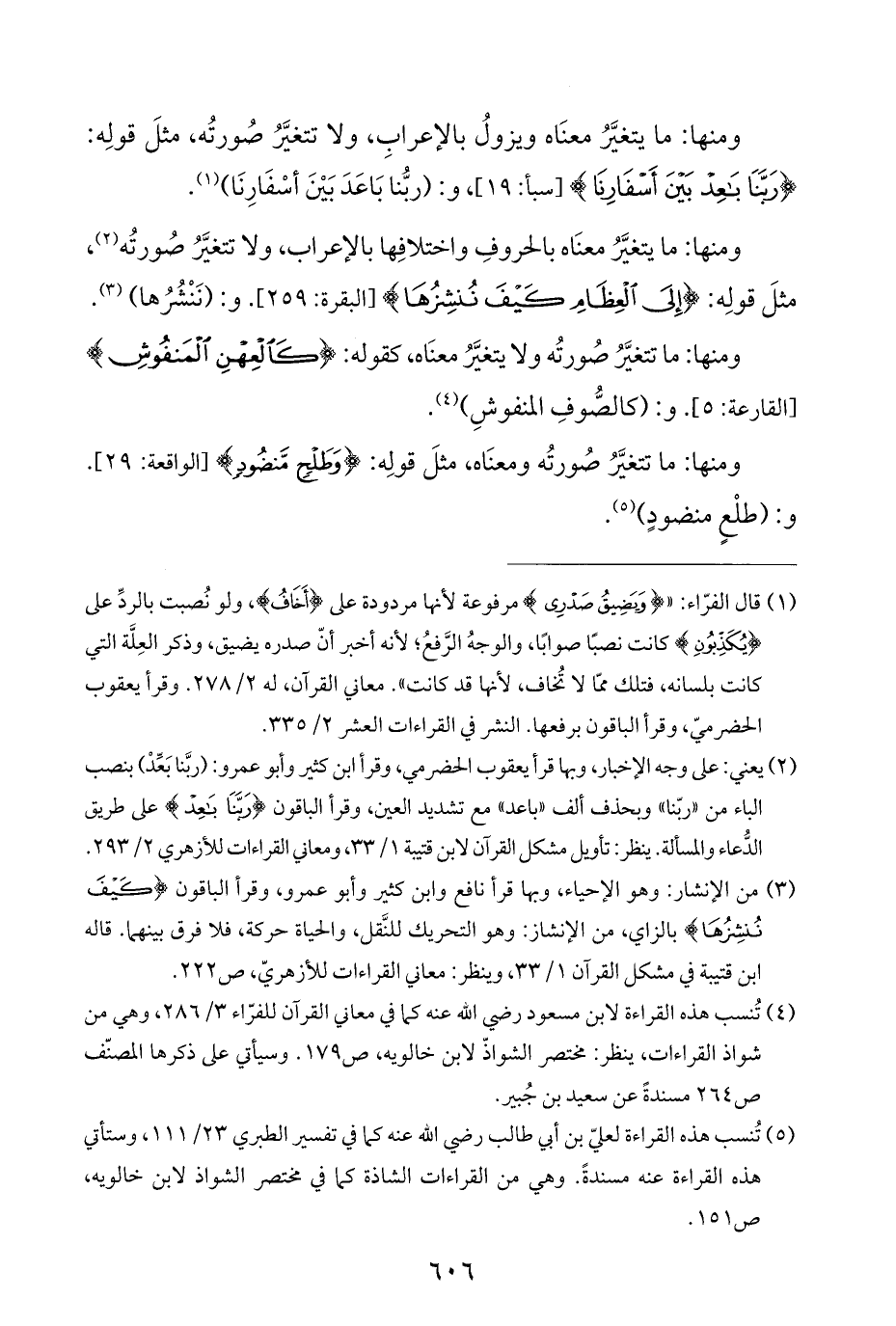 ومنها: ما يتغيَّرُ معنَاه بالحروفِ واختلافِها بالإعراب، ولا تتغيَّرُ صُورتُه (¬٢)، مثلَ قولِه: {إِلَى الْعِظَامِ كَيْفَ نُنْشِزُهَا} [البقرة: ٢٥٩]. و: (نَنْشُرُها) (¬٣).