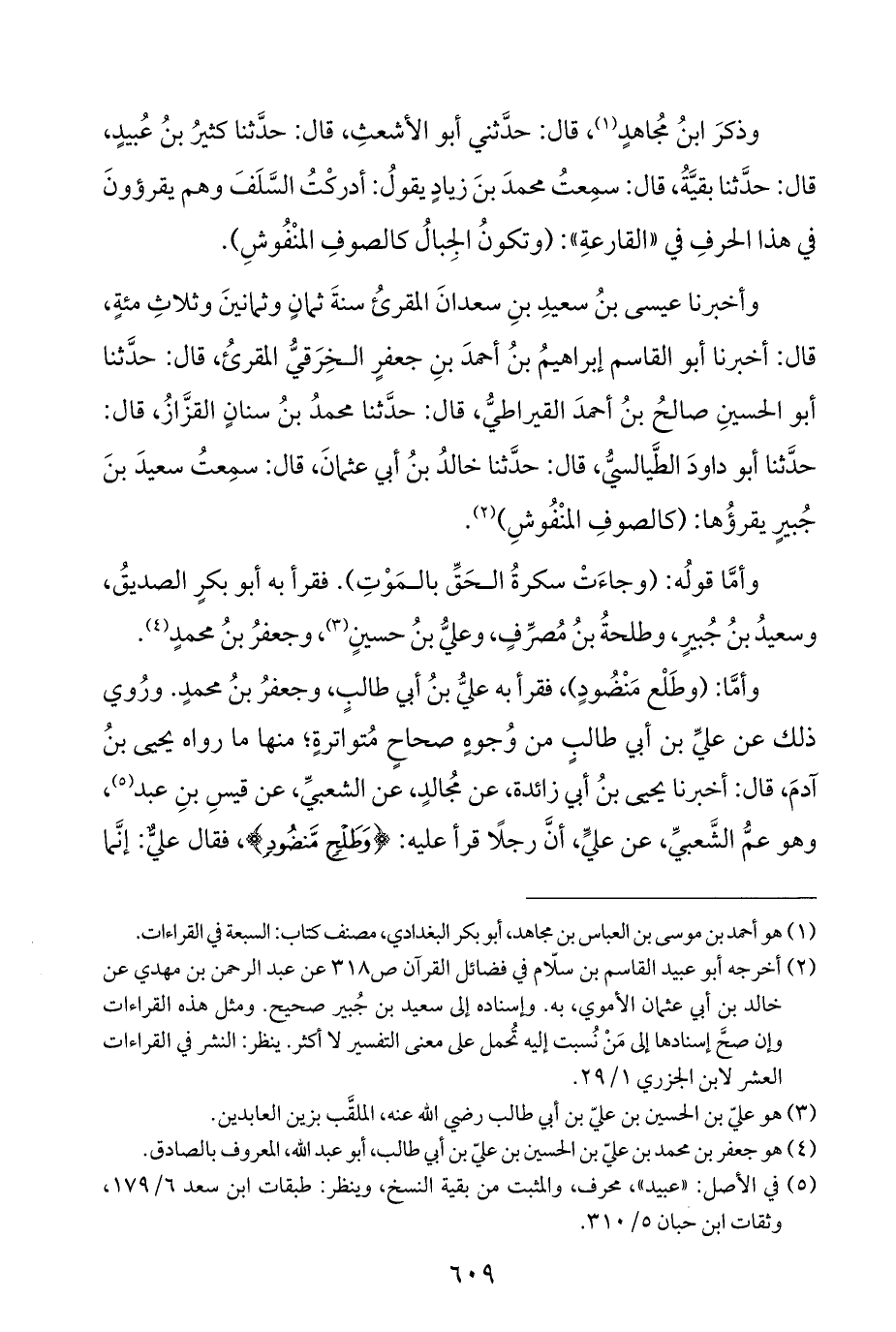 وأخبرنا عيسى بنُ سعيدِ بنِ سعدانَ المقرئُ سنةَ ثمانٍ وثمانينَ وثلاثِ مئةٍ، قال: أخبرنا أبو القاسم إبراهيمُ بنُ أحمدَ بنِ جعفرٍ الخِرَقيُّ المقرئُ، قال: حدَّثنا أبو الحسينِ صالحُ بنُ أحمدَ القيراطيُّ، قال: حدَّثنا محمدُ بنُ سنانٍ القزَّازُ، قال: حدَّثنا أبو داودَ الطَّيالسيُّ، قال: حدَّثنا خالدُ بنُ أبي عثمانَ، قال: سمِعتُ سعيدَ بنَ جُبيرٍ يقرؤُها: (كالصوفِ المنْفُوشِ) (¬٢).