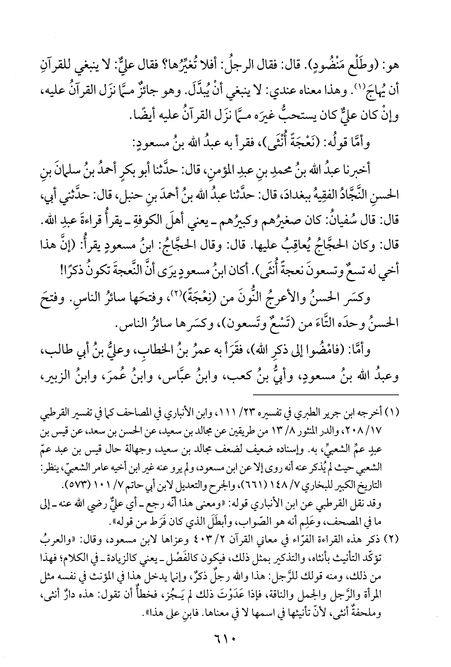 أخبرنا عبدُ الله بنُ محمدِ بنِ عبدِ المؤمنِ، قال: حدَّثنا أبو بكرٍ أحمدُ بنُ سلمانَ بنِ الحسنِ النَّجَّادُ الفقِيهُ ببغدادَ، قال: حدَّثنا عبدُ الله بنُ أحمدَ بنِ حنبل، قال: حدَّثني أبي، قال: قال سُفيانُ: كان صغيرُهم وكبيرُهم - يعني أهلَ الكوفةِ - يقرأُ قراءةَ عبدِ الله. قال: وكان الحجَّاجُ يُعاقِبُ عليها. قال: وقال الحجَّاجُ: ابنُ مسعودٍ يقرأُ: (إنَّ هذا أخي له تسعٌ وتسعونَ نعجةً أُنثَى). أكان ابنُ مسعودٍ يرَى أنَّ النَّعجةَ تكونُ ذكرًا!