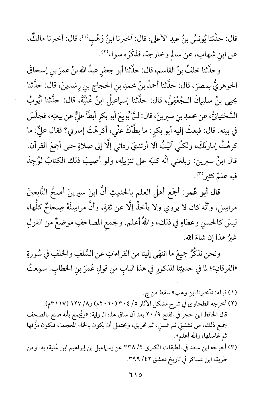 وحدَّثنا خلفُ بنُ القاسم، قال: حدَّثنا أبو جعفرٍ عبدُ الله بنُ عمرَ بنِ إسحاقَ الجوهريُّ بمصرَ، قال: حدَّثنا أحمدُ بنُ محمدِ بنِ الحجاج بنِ رِشدينَ، قال: حدَّثنا يحيى بنُ سليمانَ الجُعْفِيُّ، قال: حدَّثنا إسماعيلُ ابنُ عُليَّةَ، قال: حدَّثنا أيُّوبُ السَّختيانيُّ، عن محمدِ بنِ سيرينَ، قال: لمَّا بُويعَ أبو بكرٍ أبطَأ عليٌّ عن بيعتِه، فجلَسَ في بيته. قال: فبعثَ إليه أبو بكرٍ: ما بطَّأكَ عنِّي، أكرهْتَ إمارتي؟ فقال عليٌ: ما كرهْتُ إمارتَكَ، ولكنِّي آليْتُ ألا أرتديَ ردائي إلَّا إلى صلاةٍ حتى أجمعَ القرآن. قال ابنُ سيرين: وبلغني أنَّه كتبَه على تنزيلِه، ولو أصيبَ ذلك الكتابُ لوُجِدَ فيه علمٌ كثير (¬٣).