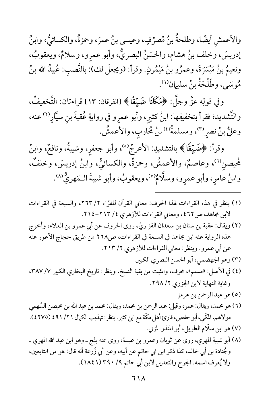 وفي قولِه عزَّ وجلَّ: {مَكَانًا ضَيِّقًا} [الفرقان: ١٣] قراءتان: التَّخفيفُ، والتَّشديد؛ فقرأ بتخفيفِها: ابنُ كثيرٍ، وأبو عمرٍو في روايةِ عُقبةَ بنِ سيَّارٍ (¬٢) عنه، وعليُّ بنُ نصرٍ (¬٣)، ومسلمةُ (¬٤) بنُ مُحاربٍ، والأعمشُ.