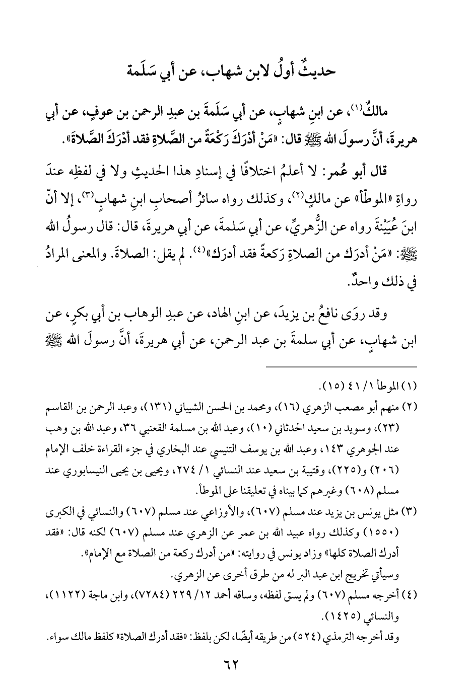قال أبو عُمر: لا أعلمُ اختلافًا في إسنادِ هذا الحديثِ ولا في لفظِه عندَ رواةِ "الموطّأ" عن مالكٍ (¬٢)، وكذلك رواه سائرُ أصحابِ ابنِ شهابٍ (¬٣)، إلا أنّ ابنَ عُيَيْنةَ رواه عن الزُّهريِّ، عن أبي سَلمةَ، عن أبي هريرةَ، قال: قال رسولُ الله - صلى الله عليه وسلم -: "مَنْ أدرَك من الصلاةِ رَكعةً فقد أدرَك" (¬٤). لم يقل: الصلاةَ. والمعنى المرادُ في ذلك واحدٌ.