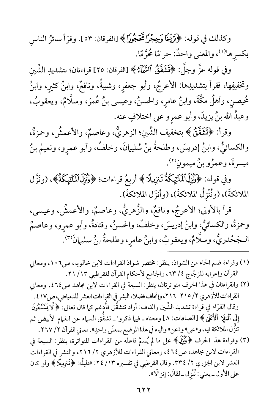 (¬٢) والقراءتان في هذا الحرف متواترتان، ينظر: السبعة في القراءات لابن مجاهد ص ٤٦٤، ومعاني القراءات للأزهري ٢/ ٢١٥ - ٢١٦، وإتحاف فضلاء البشر في القراءات العشر للدمياطي، ص ٤١٧. وقال الفرّاء في قراءة تشديد الشِّين والقاف: أراد تتشقَّق فأُدغم كما قال تعالى: {لَا يَسَّمَّعُونَ إِلَى الْمَلَإِ الْأَعْلَى} [الصافات: ٨] ومعناه - فيما ذكروا - تشقُّق السماء عن الغمام الأبيض ثم تنزُّل الملائكة فيه، و"على" و"عن" والياء في هذا الموضع بمعنًى واحدٍ". معاني القرآن ٢/ ٢٦٧.