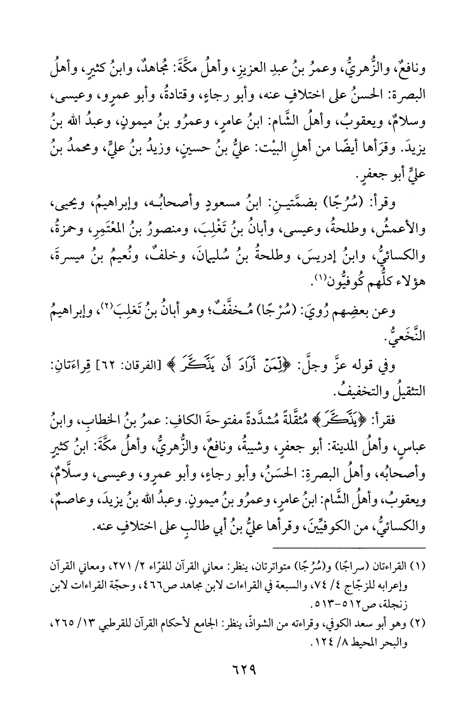 (¬١) القراءتان (سراجًا) و (سُرُجًا) متواترتان، ينظر: معاني القرآن للفرّاء ٢/ ٢٧١، ومعاني القرآن وإعرابه للزجّاج ٤/ ٧٤، والسبعة في القراءات لابن مجاهد ص ٤٦٦، وحجّة القراءات لابن زنجلة، ص ٥١٢ - ٥١٣.