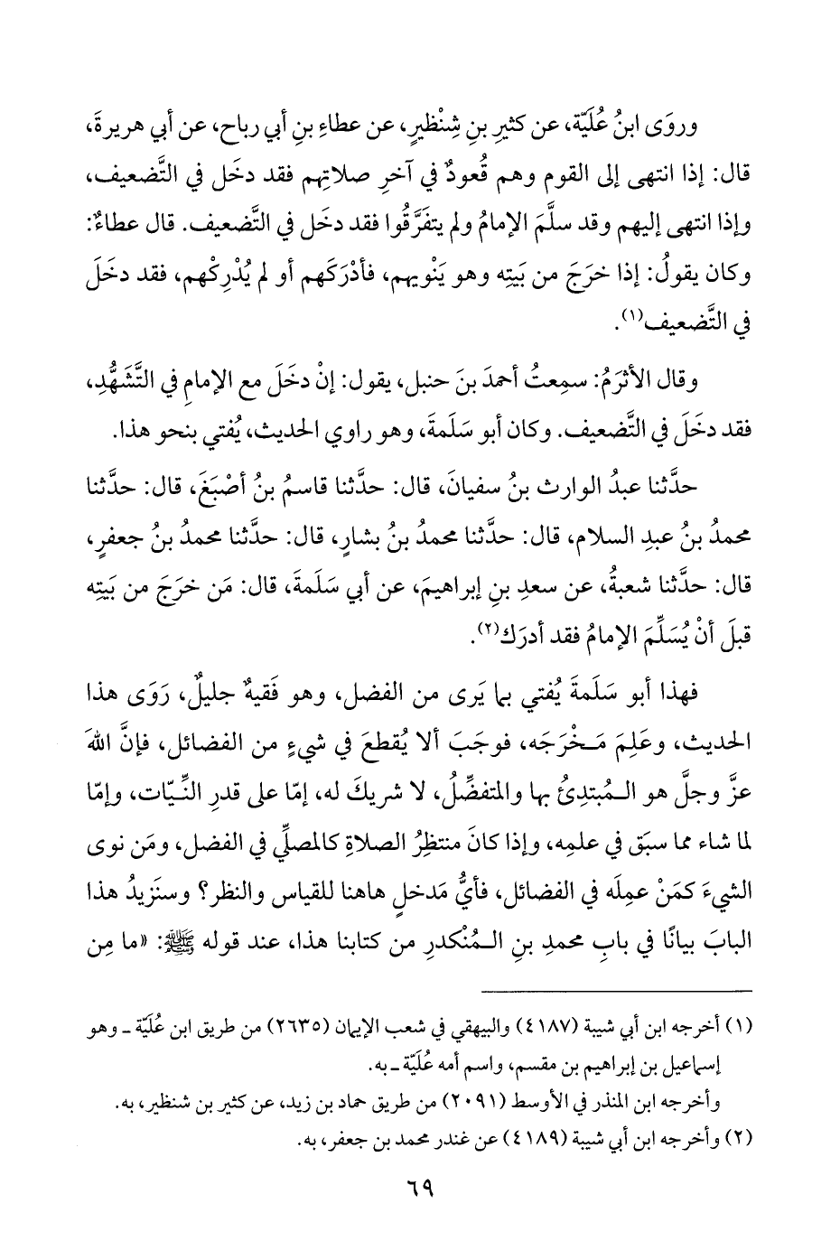 وروَى ابنُ عُلَيّة، عن كثيرِ بنِ شنْظيرٍ، عن عطاءِ بنِ أبي رباح، عن أبي هريرةَ، قال: إذا انتهى إلى القوم وهم قُعودٌ في آخرِ صلاتِهم فقد دخَل في التَّضعيف، وإذا انتهى إليهم وقد سلَّمَ الإمامُ ولم يتفَرَّقُوا فقد دخَل في التَّضعيف. قال عطاءٌ: وكان يقولُ: إذا خرَجَ من بَيتِه وهو يَنْويهم، فأدْرَكَهم أو لم يُدْرِكْهم، فقد دخَلَ في التَّضعيف (¬١).