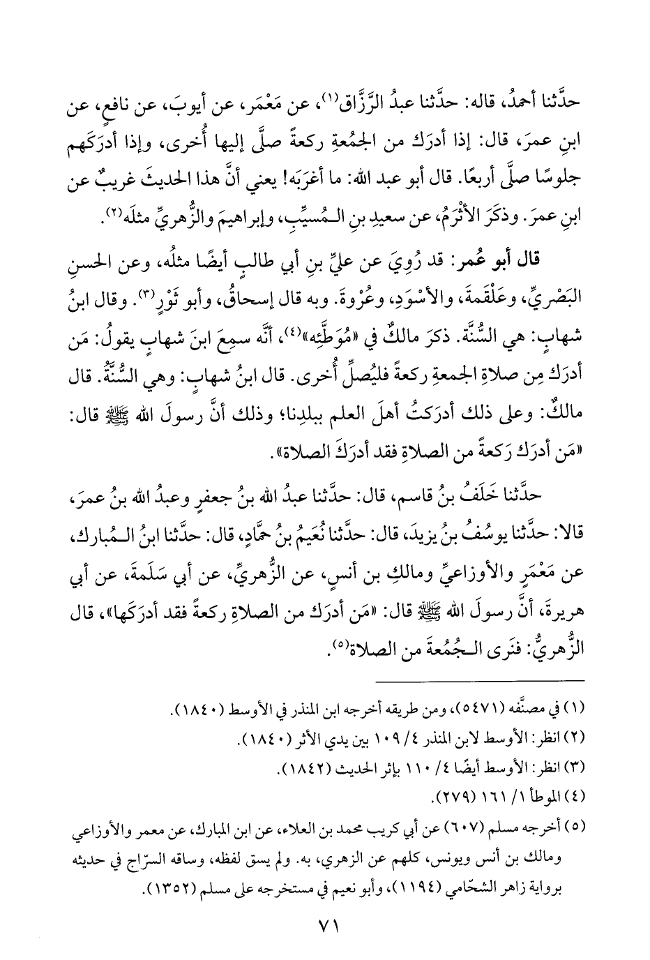 حدَّثنا أحمدُ، قاله: حدَّثنا عبدُ الرَّزَّاق (¬١)، عن مَعْمَر، عن أيوبَ، عن نافعٍ، عن ابنِ عمرَ، قال: إذا أدرَك من الجمُعةِ ركعةً صلَّى إليها أُخرى، وإذا أدرَكَهم جلوسًا صلَّى أربعًا. قال أبو عبد الله: ما أغرَبَه! يعني أنَّ هذا الحديثَ غريبٌ عن ابنِ عمرَ. وذكَرَ الأثْرَمُ، عن سعيدِ بنِ المُسيِّبِ، وإبراهيمَ والزُّهريِّ مثلَه (¬٢).