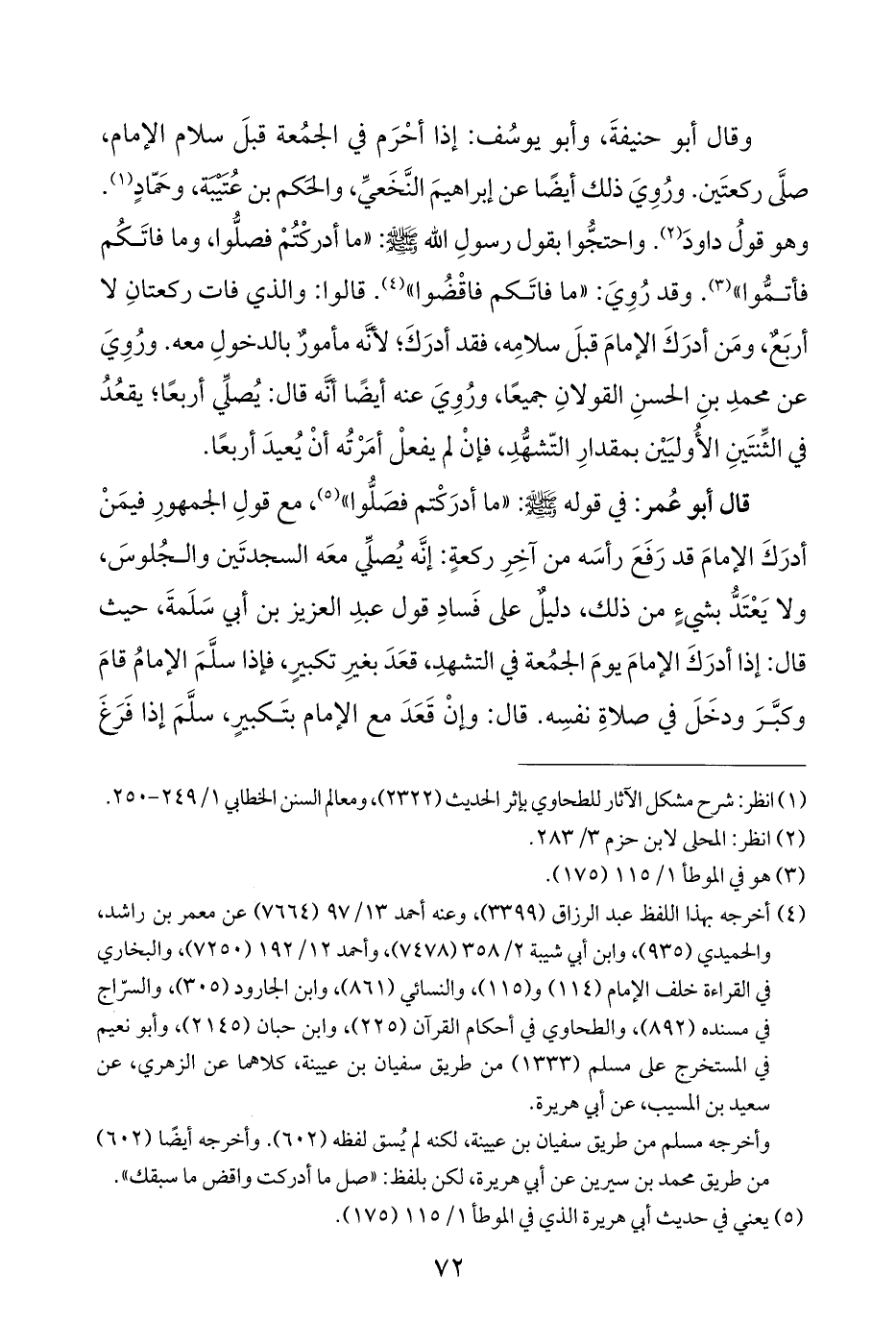 وقال أبو حنيفةَ، وأبو يوسُف: إذا أحْرَم في الجمُعة قبلَ سلام الإمام، صلَّى ركعتَين. ورُوِيَ ذلك أيضًا عن إبراهيمَ النَّخَعيِّ، والحَكَم بن عُتَيْبَة، وحَمّادٍ (¬١). وهو قولُ داودَ (¬٢). واحتجُّوا بقول رسولِ الله - صلى الله عليه وسلم -: "ما أدركْتُمْ فصلُّوا، وما فاتَكُم فأتمُّوا" (¬٣). وقد رُوِيَ: "ما فاتَكم فاقْضُوا" (¬٤). قالوا: والذي فات ركعتانِ لا أربَعٌ، ومَن أدرَكَ الإمامَ قبلَ سلامِه، فقد أدرَكَ؛ لأنَّه مأمورٌ بالدخولِ معه. ورُوِيَ عن محمدِ بنِ الحسنِ القولانِ جميعًا، ورُوِيَ عنه أيضًا أنَّه قال: يُصلِّي أربعًا؛ يقعُدُ في الثِّنتَينِ الأُوليَيْن بمقدارِ التّشهُّدِ، فإنْ لم يفعلْ أمَرْتُه أنْ يُعيدَ أربعًا.