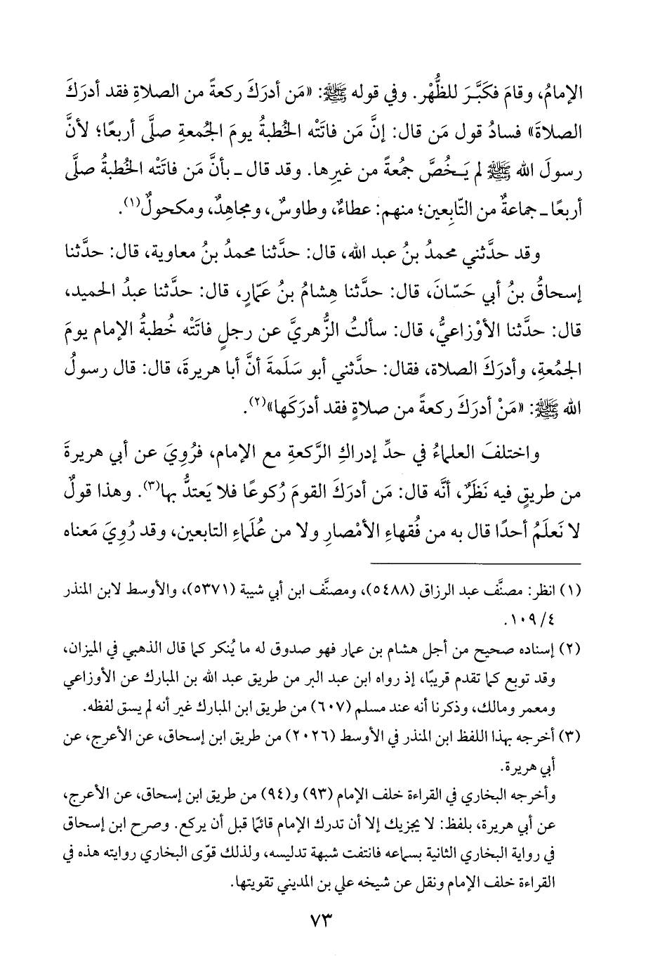 وقد حدَّثني محمدُ بنُ عبد الله، قال: حدَّثنا محمدُ بنُ معاوية، قال: حدَّثنا إسحاقُ بنُ أبي حَسّانَ، قال: حدَّثنا هِشامُ بنُ عَمّارٍ، قال: حدَّثنا عبدُ الحميد، قال: حدَّثنا الأوْزاعيُّ، قال: سألتُ الزُّهريَّ عن رجلٍ فاتَتْه خُطبةُ الإمام يومَ الجمُعةِ، وأدرَكَ الصلاة، فقال: حدَّثني أبو سَلَمةَ أنَّ أبا هريرةَ، قال: قال رسولُ الله - صلى الله عليه وسلم -: "مَنْ أدرَكَ ركعةً من صلاةٍ فقد أدرَكَها" (¬٢).
