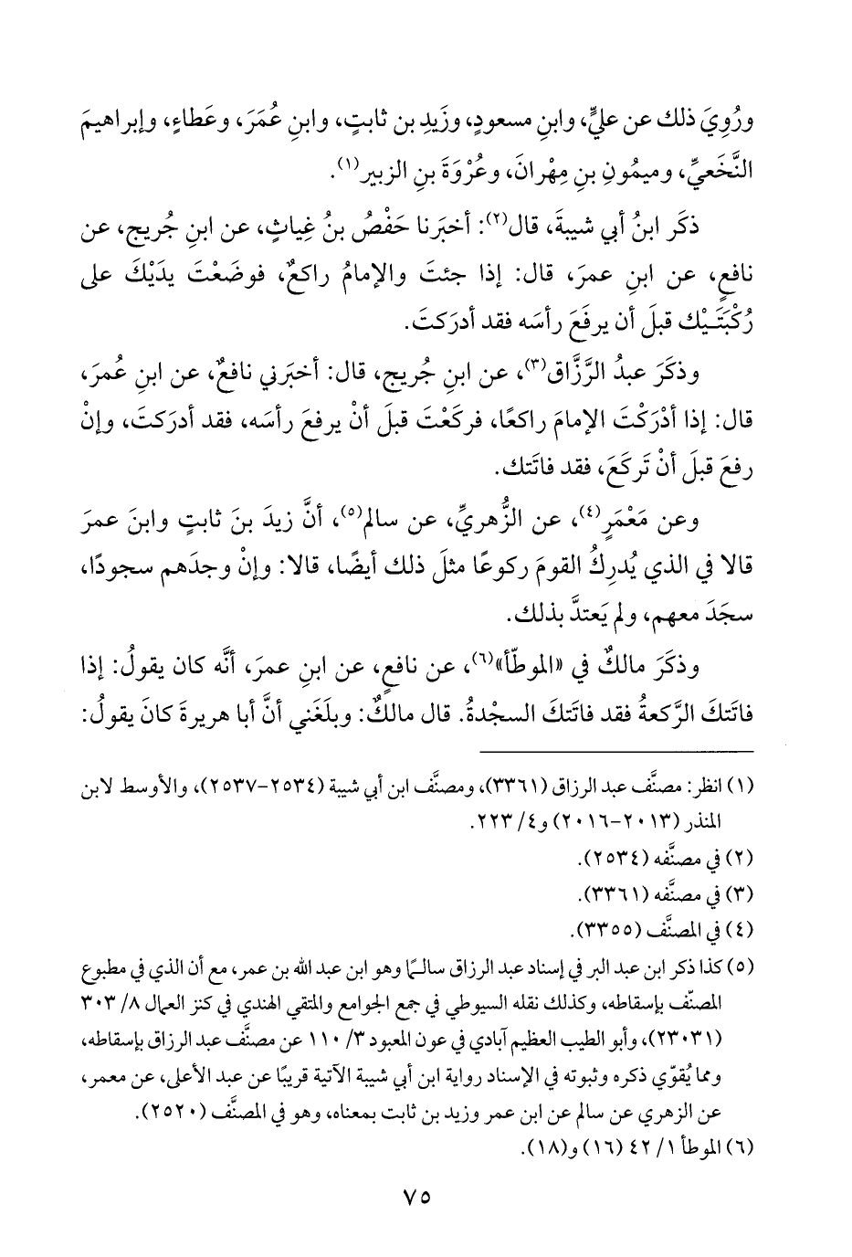 وذكَرَ عبدُ الرَّزَّاق (¬٣)، عن ابنِ جُريج، قال: أخبَرني نافعٌ، عن ابنِ عُمرَ، قال: إذا أدْرَكْتَ الإمامَ راكعًا، فركَعْتَ قبلَ أنْ يرفعَ رأسَه، فقد أدرَكتَ، وإنْ رفعَ قبلَ أنْ تَركَعَ، فقد فاتَتك.