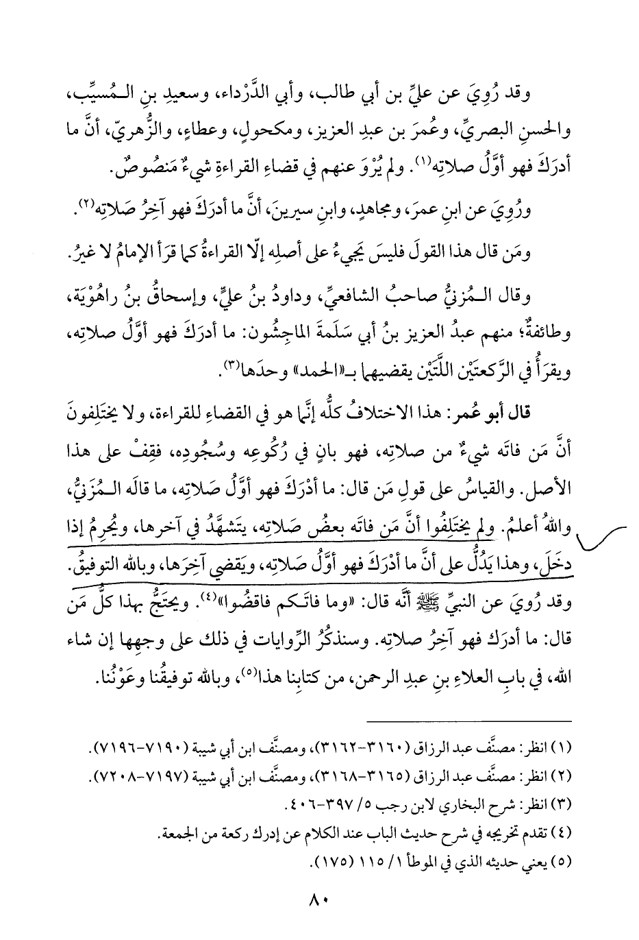 وقد رُوِيَ عن عليِّ بن أبي طالب، وأبي الدَّرْداء، وسعيدِ بنِ المُسيِّب، والحسنِ البصريِّ، وعُمرَ بن عبدِ العزيز، ومكحولٍ، وعطاءٍ، والزُّهريّ، أنَّ ما أدرَكَ فهو أوَّلُ صلاتِه (¬١). ولم يُرْوَ عنهم في قضاءِ القراءةِ شيءٌ مَنصُوصٌ.
