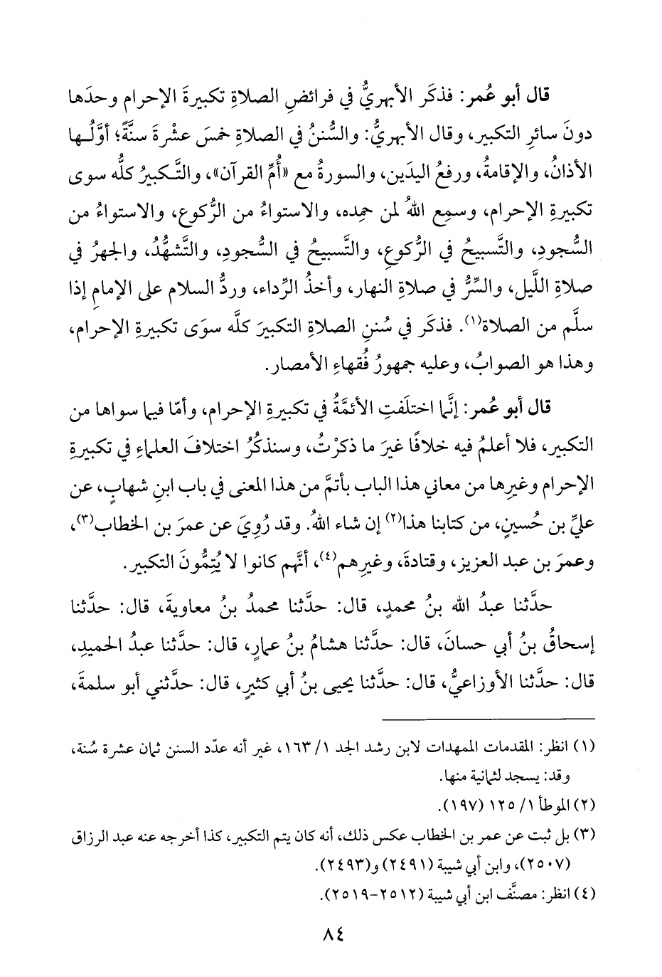 قال أبو عُمر: فذكَر الأبهريُّ في فرائضِ الصلاةِ تكبيرةَ الإحرام وحدَها دونَ سائرِ التكبير، وقال الأجهريُّ: والسُّننُ في الصلاةِ خمسَ عشْرةَ سنّةً؛ أوَّلُها الأذانُ، والإقامةُ، ورفعُ اليدَين، والسورةُ مع "أُمِّ القرآن"، والتَّكبيرُ كلُّه سوى تكبير الإحرام، وسمِع اللهُ لمن حمِده، والاستواءُ من الرُّكوع، والاستواءُ من السُّجودِ، والتَّسبيحُ في الرُّكوعِ، والتَّسبيحُ في السُّجودِ، والتَّشهُّدُ، والجهرُ في صلاةِ اللَّيل، والسِّرُّ في صلاةِ النهار، وأخذُ الرِّداء، وردُّ السلام على الإمامِ إذا سلَّم من الصلاة (¬١). فذكَر في سُننِ الصلاةِ التكبيرَ كلَّه سوَى تكبير الإحرام، وهذا هو الصوابُ، وعليه جمهورُ فُقهاءِ الأمصار.