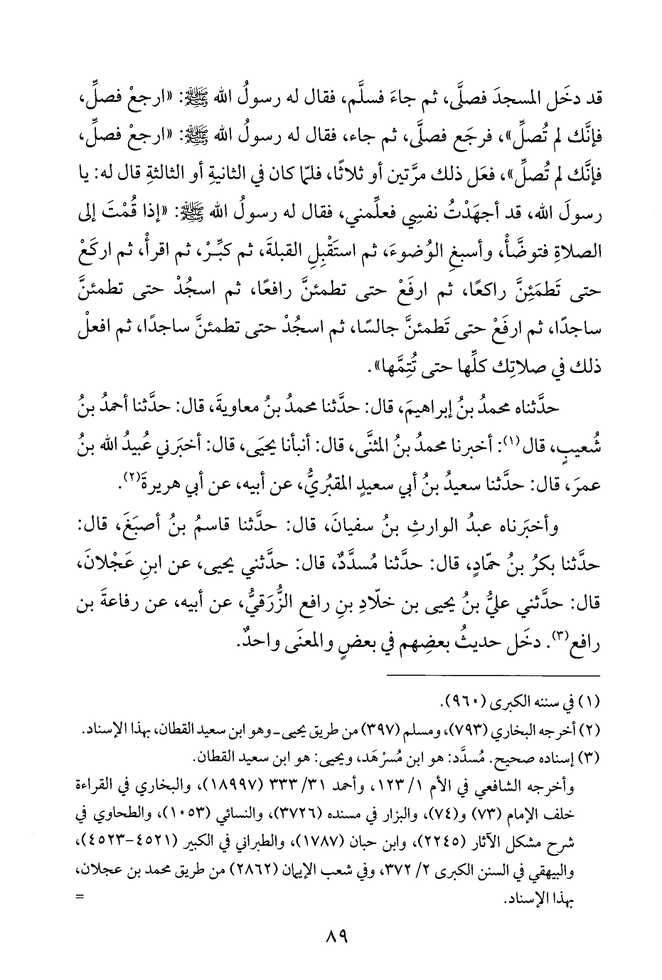 وأخبَرناه عبدُ الوارثِ بنُ سفيانَ، قال: حدَّثنا قاسمُ بنُ أصبَغَ، قال: حدَّثنا بكرُ بنُ حمّادٍ، قال: حدَّثنا مُسدَّدٌ، قال: حدَّثني يحيى، عن ابنِ عَجْلانَ، قال: حدَّثني عليُّ بنُ يحيى بن خلّادَ بنِ رافع الزُّرَقيُّ، عن أبيه، عن رفاعةَ بن رافع (¬٣). دخَل حديث بعضِهم في بعضٍ والمعنَى واحدٌ.