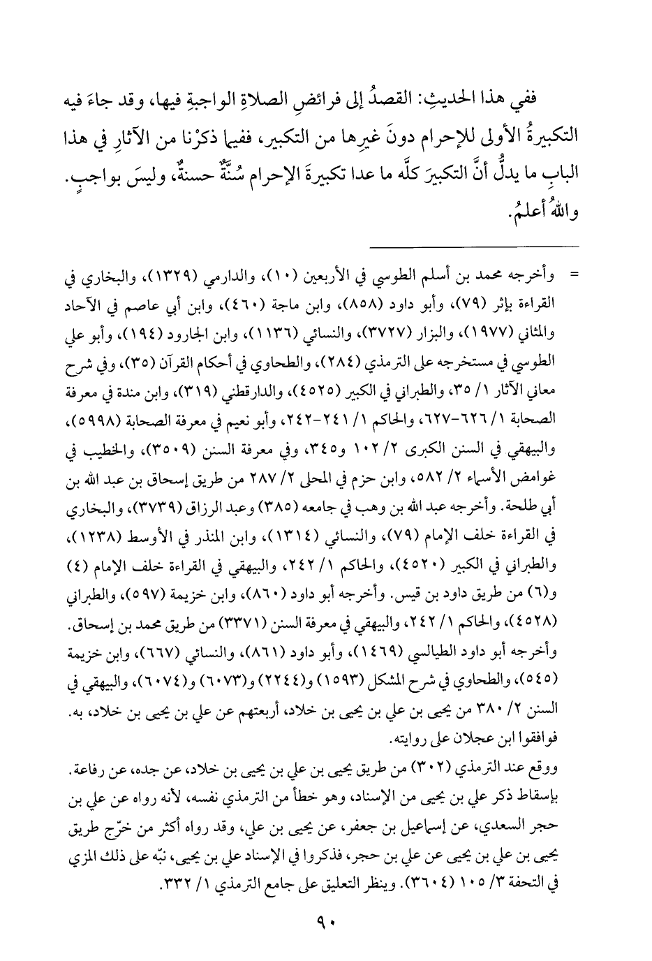ففي هذا الحديثِ: القصدُ إلى فرائضِ الصلاةِ الواجبةِ فيها، وقد جاءَ فيه التكبيرةُ الأولى للإحرام دونَ غيرِها من التكبير، ففيما ذكرْنا من الآثارِ في هذا البابِ ما يدلُّ أنَّ التكبيرَ كلَّه ما عدا تكبيرةَ الإحرام سُنَّةٌ حسنةٌ، وليسَ بواجبٍ. واللهُ أعلمُ.