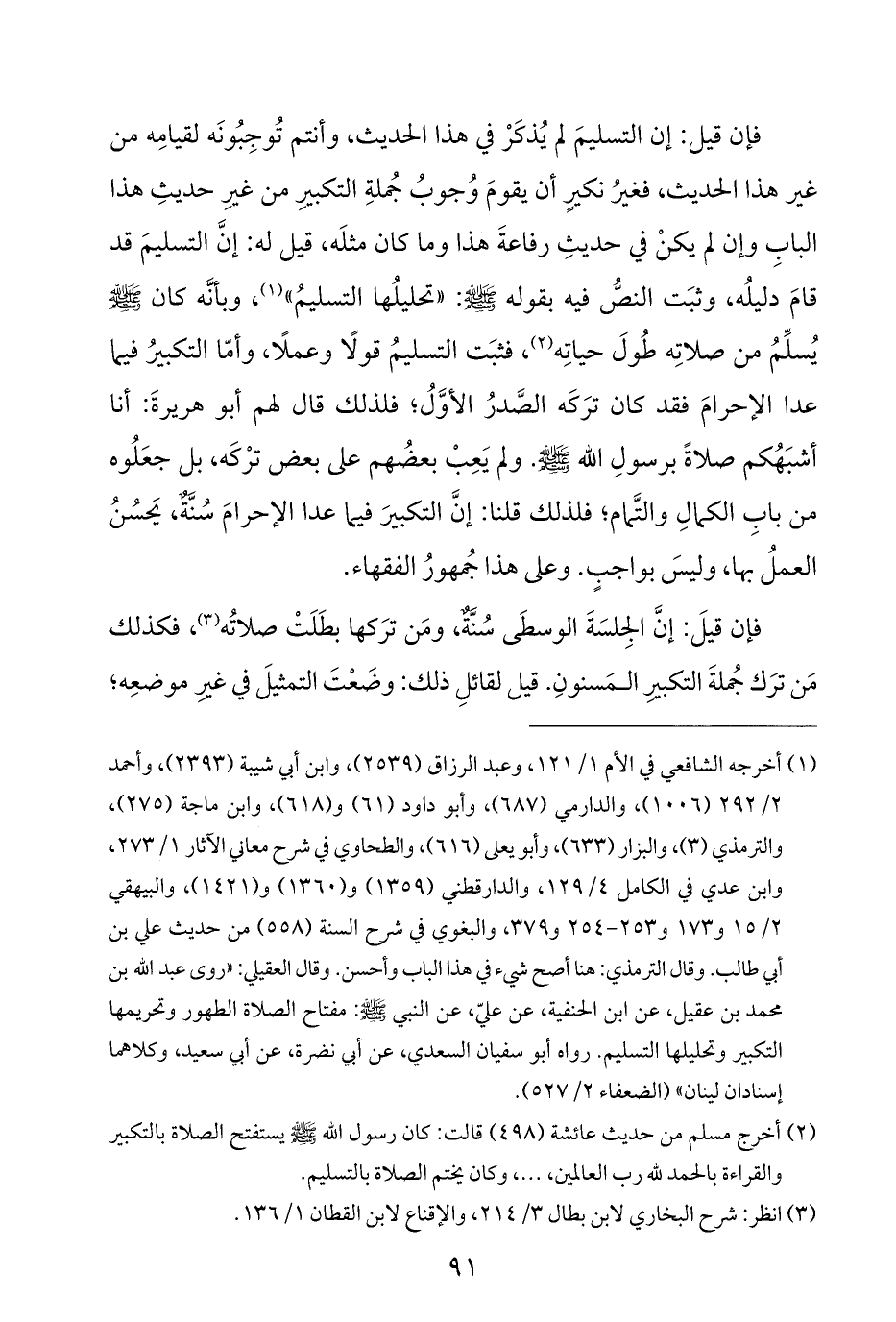 فإن قيل: إن التسليمَ لم يُذكَرْ في هذا الحديث، وأنتم تُوجِبُونَه لقيامِه من غير هذا الحديث، فغيرُ نكيرٍ أن يقومَ وُجوبُ جُملةِ التكبيرِ من غيرِ حديثِ هذا البابِ وإن لم يكنْ في حديثِ رفاعةَ هذا وما كان مثلَه، قيل له: إنَّ التسليمَ قد قامَ دليلُه، وثبَت النصُّ فيه بقوله - صلى الله عليه وسلم -: "تحليلُها التسليمُ" (¬١)، وبأنَّه كان - صلى الله عليه وسلم - يُسلِّمُ من صلاتِه طُولَ حياتِه (¬٢)، فثبَت التسليمُ قولًا وعملًا، وأمّا التكبيرُ فيما عدا الإحرامَ فقد كان ترَكَه الصدرُ الأوَّلُ، فلذلك قال لهم أبو هريرةَ: أنا أشبَهُكم صلاةً برسولِ الله - صلى الله عليه وسلم -. ولم يَعِبْ بعضُهم على بعض ترْكَه، بل جعَلُوه من بابِ الكمالِ والتَّمام؛ فلذلك قلنا: إنَّ التكبيرَ فيما عدا الإحرامَ سُنَّةٌ، يَحسُنُ العملُ بها، وليسَ بواجبٍ. وعلى هذا جُمهورُ الفقهاء.