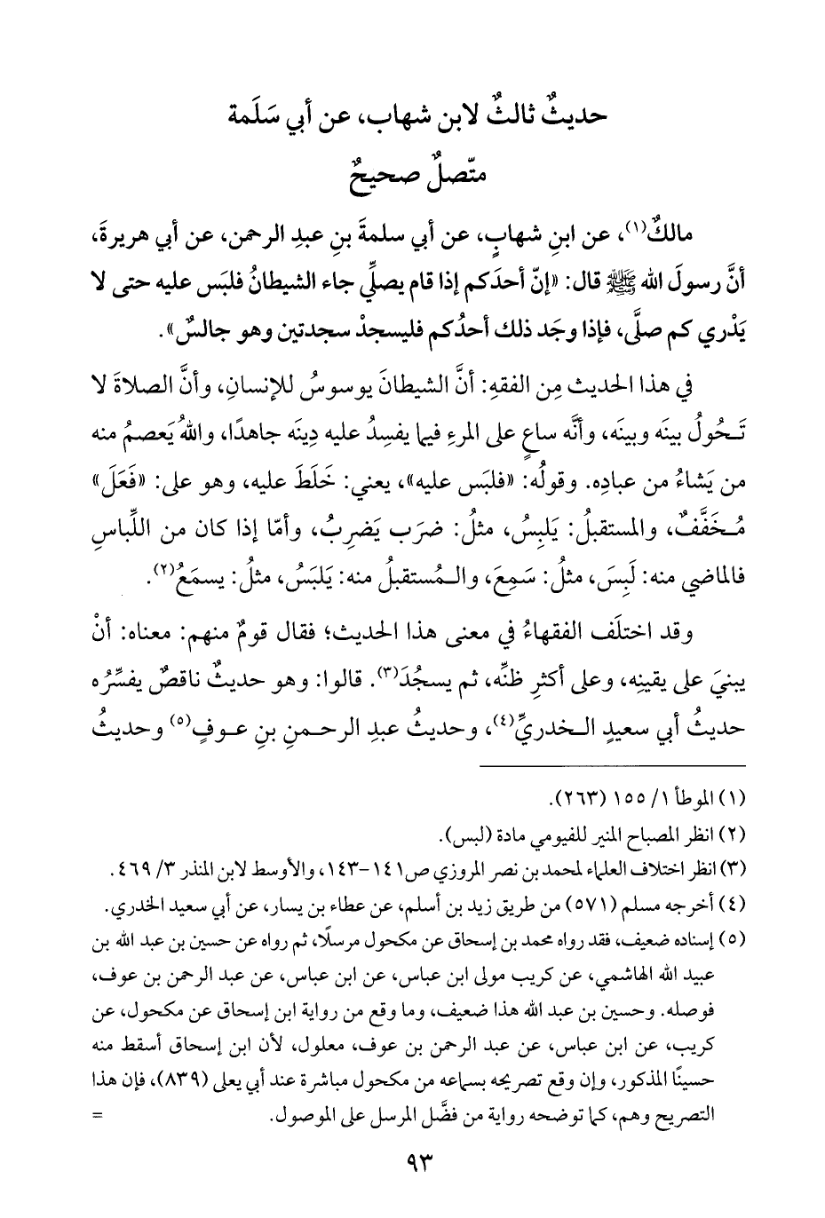 مالكٌ (¬١)، عن ابنِ شهابٍ، عن أبي سلمةَ بنِ عبدِ الرحمن، عن أبي هريرةَ، أنَّ رسولَ الله - صلى الله عليه وسلم - قال: "إنّ أحدَكم إذا قام يصلِّي جاء الشيطانُ فلبَس عليه حتى لا يَدْري كم صلَّى، فإذا وجَد ذلك أحدُكم فليسجدْ سجدتين وهو جالسٌ".