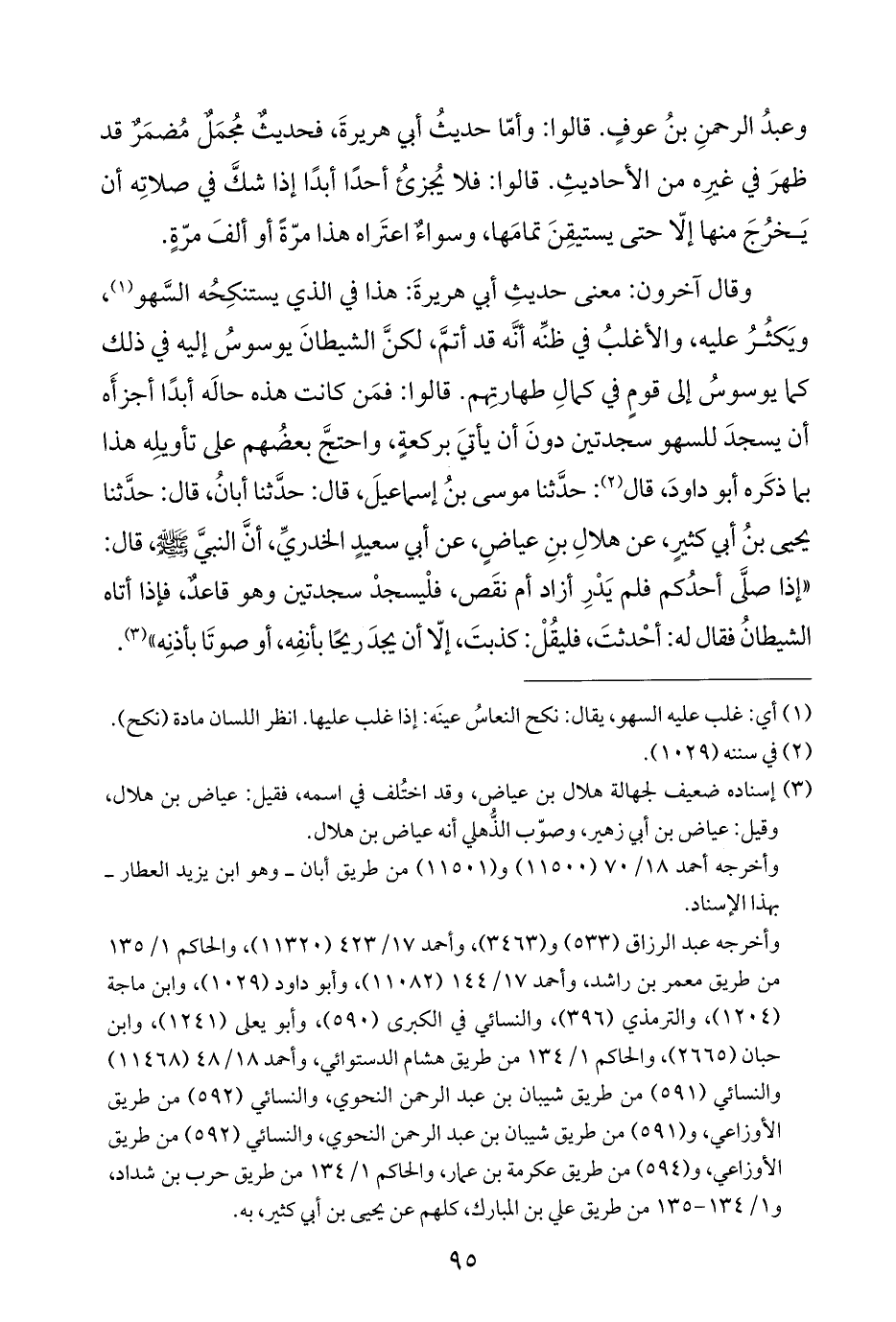 وقال آخرون: معنى حديثِ أبي هريرةَ: هذا في الذي يستنكِحُه السَّهو (¬١)، ويَكثُرُ عليه، والأغلبُ في ظنِّه أنَّه قد أتمَّ، لكنَّ الشيطانَ يوسوسُ إليه في ذلك كما يوسوسُ إلى قومٍ في كمالِ طهارتِهم. قالوا: فمَن كانت هذه حالَه أبدًا أجزأَه أن يسجدَ للسهو سجدتين دونَ أن يأتيَ بركعةٍ، واحتجَّ بعضُهم على تأويلِه هذا بما ذكَره أبو داودَ، قال (¬٢): حدَّثنا موسى بنُ إسماعيلَ، قال: حدَّثنا أبانُ، قال: حدَّثنا يحيى بنُ أبي كثيرٍ، عن هلالِ بنِ عياضٍ، عن أبي سعيدٍ الخدريِّ، أنَّ النبيَّ - صلى الله عليه وسلم -، قال: "إذا صلَّى أحدُكم فلم يَدْرِ أزاد أم نقَص، فلْيسجدْ سجدتين وهو قاعدٌ، فإذا أتاه الشيطانُ فقال له: أحْدثتَ، فليقُلْ: كذبتَ، إلّا أن يجدَ ريحًا بأنفِه، أو صوتًا بأذنِه" (¬٣).