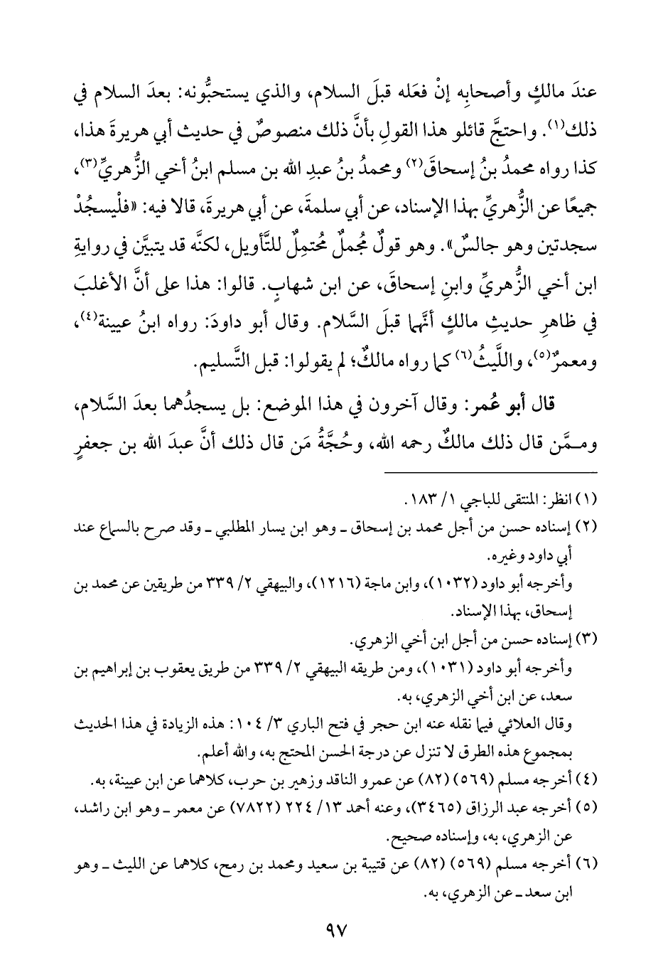 قال أبو عُمر: وقال آخرون في هذا الموضع: بل يسجدُهما بعدَ السَّلام، وممَّن قال ذلك مالكٌ رحمه الله، وحُجَّةُ مَن قال ذلك أنَّ عبدَ الله بن جعفرٍ
