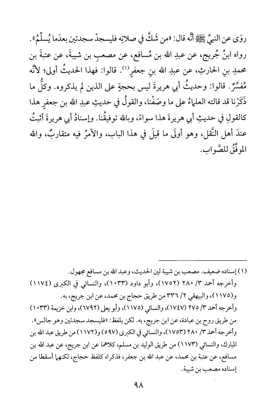 روَى عن النبيِّ - صلى الله عليه وسلم - أنَّه قال: "من شَكَّ في صلاتِه فليسجدْ سجدتين بعدَما يُسلِّمُ". رواه ابنُ جُريج، عن عبدِ الله بن مُسافع، عن مصعبِ بن شيبةَ، عن عتبةَ بن محمدِ بنِ الحارثِ، عن عبدِ الله بنِ جعفرٍ (¬١). قالوا: فهذا الحديثُ أولى؛ لأنَّه مُفسِّرٌ. قالوا: وحديثُ أبي هريرةَ ليس بحجةٍ على الذين لم يذكروه. وكلُّ ما ذَكَرْنا قد قالته العلماءُ على ما وصَفْنا، والقولُ في حديثِ عبدِ الله بن جعفرٍ هذا كالقولِ في حديثِ أبي هريرةَ هذا سواءً، وبالله توفيقُنا. وإسنادُ أبي هريرةَ أثبتُ عندَ أهل النَّقل، وهو أولَى ما قيلَ في هذا الباب، والأمرُ فيه متقاربٌ، والله الموفِّقُ للصَّواب.