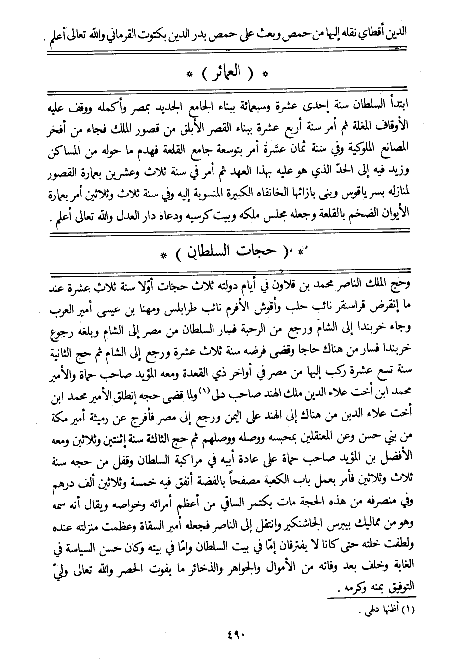 وحج الملك الناصر محمد بن قلاون في أيام دولته ثلاث حجات أوّلا سنة ثلاث عشرة عند ما انقرض قراسنقر نائب حلب وأقوش الأفرم نائب طرابلس ومهنا بن عيسى أمير العرب وجاء خربندا إلى الشام ورجع من الرحبة فسار السلطان من مصر إلى الشام وبلغه رجوع خربندا فسار من هناك حاجا وقضى فرضه سنة ثلاث عشرة ورجع إلى الشام ثم حج الثانية سنة تسع عشرة ركب إليها من مصر في أواخر ذي القعدة ومعه المؤيد صاحب حماة والأمير محمد ابن أخت علاء الدين ملك الهند صاحب دلى [1] ولما قضى حجه انطلق الأمير محمد ابن أخت علاء الدين من هناك إلى الهند على اليمن ورجع إلى مصر فأفرج عن رميثة أمير مكة من بني حسن وعن المعتقلين بمحبسه ووصله ووصلهم ثم حج الثالثة سنة اثنتين وثلاثين ومعه الأفضل بن المؤيد صاحب حماة على عادة أبيه في مراكبة السلطان وقفل من حجه سنة ثلاث وثلاثين فأمر بعمل باب الكعبة مصحفا بالفضة أنفق فيه خمسة وثلاثين ألف درهم وفي منصرفه من هذه الحجة مات بكتمر الساقي من أعظم أمرائه وخواصه ويقال أنه سمه وهو من مماليك بيبرس الجاشنكير وانتقل إلى الناصر فجعله أمير السقاة وعظمت منزلته عنده ولطفت خلته حتى كانا لا يفترقان إمّا في بيت السلطان وإمّا في بيته وكان حسن السياسة في الغاية وخلف بعد وفاته من الأموال والجواهر والذخائر ما يفوت الحصر والله تعالى وليّ التوفيق بمنه وكرمه.