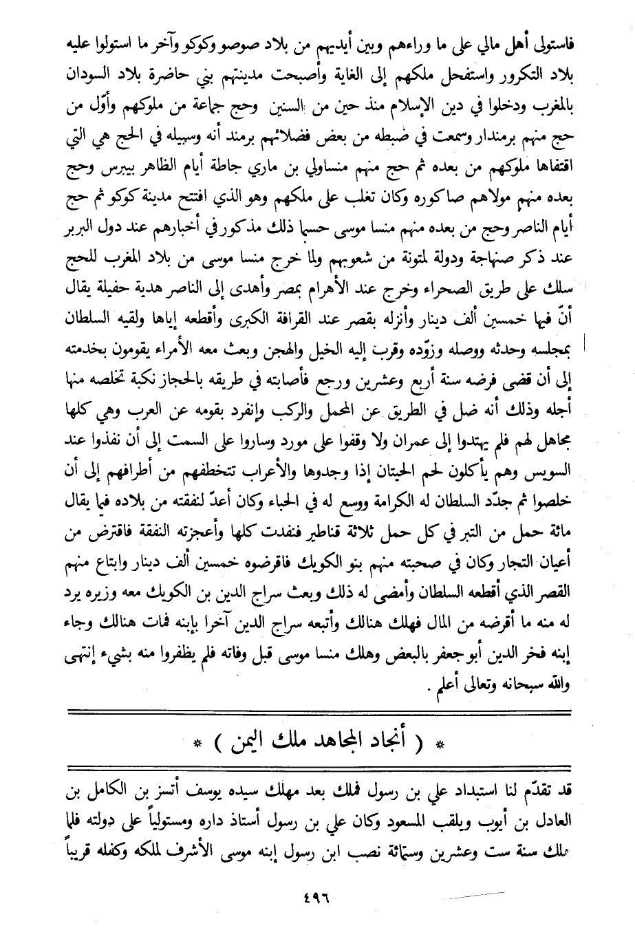 فاستولى أهل مالي على ما وراءهم وبين أيديهم من بلاد صوصو وكوكو وآخر ما استولوا عليه بلاد التكرور واستفحل ملكهم إلى الغاية وأصبحت مدينتهم بني حاضرة بلاد السودان بالمغرب ودخلوا في دين الإسلام منذ حين من السنين وحج جماعة من ملوكهم وأوّل من حج منهم برمندار وسمعت في ضبطه من بعض فضلائهم برمند أنه وسبيله في الحج هي التي اقتفاها ملوكهم من بعده ثم حج منهم منسا ولي بن ماري جاطة أيام الظاهر بيبرس وحج بعده منهم مولاهم صاكوره وكان تغلب على ملكهم وهو الّذي افتتح مدينة كوكو ثم حج أيام الناصر وحج من بعده منهم منسا موسى حسبما ذلك مذكور في أخبارهم عند دول البربر عند ذكر صنهاجة ودولة لمتونة من شعوبهم ولما خرج منسا موسى من بلاد المغرب للحج سلك على طريق الصحراء وخرج عند الأهرام بمصر وأهدى إلى الناصر هدية حفيلة يقال أنّ فيها خمسين ألف دينار وأنزله بقصر عند القرافة الكبرى وأقطعه إياها ولقيه السلطان بمجلسه وحدثه ووصله وزوّده وقرب إليه الخيل والهجن وبعث معه الأمراء يقومون بخدمته إلى أن قضى فرضه سنة أربع وعشرين ورجع فأصابته في طريقه بالحجاز نكبة تخلصه منها أجله وذلك أنه ضل في الطريق عن المحمل والركب وانفرد بقومه عن العرب وهي كلها مجاهل لهم فلم يهتدوا إلى عمران ولا وقفوا على مورد وساروا على السمت إلى أن نفذوا عند السويس وهم يأكلون لحم الحيتان إذا وجدوها والأعراب تتخطفهم من أطرافهم إلى أن خلصوا ثم جدّد السلطان له الكرامة ووسع له في الحباء وكان أعدّ لنفقته من بلاده فيما يقال مائة حمل من التبر في كل حمل ثلاثة قناطير فنفدت كلها وأعجزته النفقة فاقترض من أعيان التجار وكان في صحبته منهم بنو الكويك فاقرضوه خمسين ألف دينار واتباع منهم القصر الّذي أقطعه السلطان وأمضى له ذلك وبعث سراج الدين بن الكويك معه وزيره يرد له منه ما أقرضه من المال فهلك هنالك وأتبعه سراج الدين آخرا بابنه فمات هنالك وجاء ابنه فخر الدين أبو جعفر بالبعض وهلك منسا موسى قبل وفاته فلم يظفروا منه بشيء انتهى والله سبحانه وتعالى أعلم.
