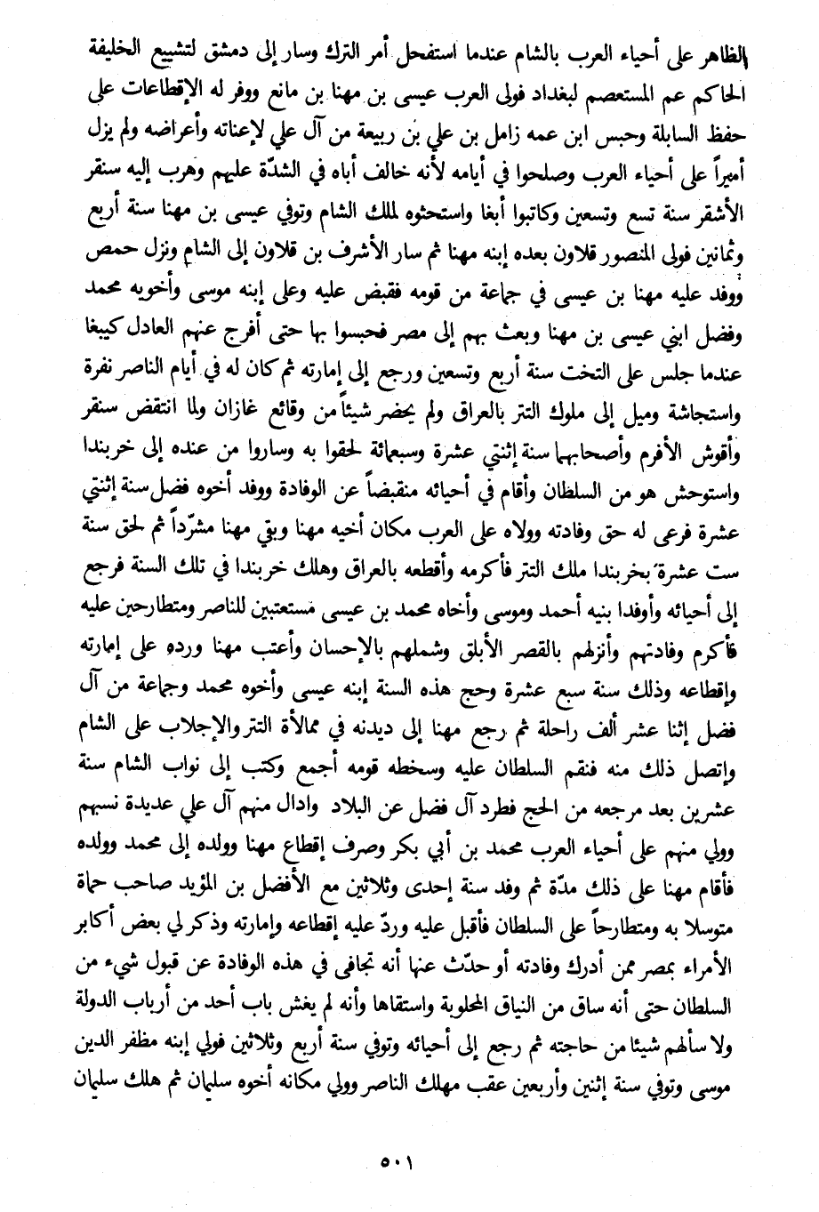الظاهر على أحياء العرب بالشام عند ما استفحل أمر الترك وسار إلى دمشق لتشييع الخليفة الحاكم عم المستعصم لبغداد فولى العرب عيسى بن مهنا بن مانع ووفر له الإقطاعات على حفظ السابلة وحبس ابن عمه زامل بن علي بن ربيعة من آل علي لإعناته وأعراضه ولم يزل أميرا على أحياء العرب وصلحوا في أيامه لأنه خالف أباه في الشدّة عليهم وهرب إليه سنقر الأشقر سنة تسع وتسعين وكاتبوا أبغا واستحثوه لملك الشام وتوفي عيسى بن مهنا سنة أربع وثمانين فولى المنصور قلاون بعده ابنه مهنا ثم سار الأشرف بن قلاون إلى الشام ونزل حمص ووفد عليه مهنا بن عيسى في جماعة من قومه فقبض عليه وعلى ابنه موسى وأخويه محمد وفضل ابني عيسى بن مهنا وبعث بهم إلى مصر فحبسوا بها حتى أفرج عنهم العادل كيبغا عند ما جلس على التخت سنة أربع وتسعين ورجع إلى إمارته ثم كان له في أيام الناصر نفرة واستجاشة وميل إلى ملوك التتر بالعراق ولم يحضر شيئا من وقائع غازان ولما انتقض سنقر وأقوش الأفرم وأصحابهما سنة اثنتي عشرة وسبعمائة لحقوا به وساروا من عنده إلى خربندا واستوحش هو من السلطان وأقام في أحيائه منقبضا عن الوفادة ووفد أخوه فضل سنة اثنتي عشرة فرعى له حق وفادته وولاه على العرب مكان أخيه مهنا وبقي مهنا مشرّدا ثم لحق سنة ست عشرة بخربندا ملك التتر فأكرمه وأقطعه بالعراق وهلك خربندا في تلك السنة فرجع إلى أحيائه وأوفد ابنيه أحمد وموسى وأخاه محمد بن عيسى مستعتبين للناصر ومتطارحين عليه فأكرم وفادتهم وأنزلهم بالقصر الأبلق وشملهم بالإحسان وأعتب مهنا ورده على إمارته وإقطاعه وذلك سنة سبع عشرة وحج هذه السنة ابنه عيسى وأخوه محمد وجماعة من آل فضل اثنا عشر ألف راحلة ثم رجع مهنا إلى ديدنه في ممالأة التتر والإجلاب على الشام واتصل ذلك منه فنقم السلطان عليه وسخطه قومه أجمع وكتب إلى نواب الشام سنة عشرين بعد مرجعه من الحج فطرد آل فضل عن البلاد وأدال منهم آل علي عديدة نسبهم وولي منهم على أحياء العرب محمد بن أبي بكر وصرف إقطاع مهنا وولده إلى محمد وولده فأقام مهنا على ذلك مدّة ثم وفد سنة إحدى وثلاثين مع الأفضل بن المؤيد صاحب حماة متوسلا به ومتطارحا على السلطان فأقبل عليه وردّ عليه إقطاعه وإمارته وذكر لي بعض أكابر الأمراء بمصر ممن أدرك وفادته أو حدّث عنها أنه تجافى في هذه الوفادة عن قبول شيء من السلطان حتى أنه ساق من النياق المحلوبة واستقاها وأنه لم يغش باب أحد من أرباب الدولة ولا سألهم شيئا من حاجته ثم رجع إلى أحيائه وتوفي سنة أربع وثلاثين فولي ابنه مظفر الدين موسى وتوفي سنة اثنتين وأربعين عقب مهلك الناصر وولي مكانه أخوه سليمان ثم هلك سليمان