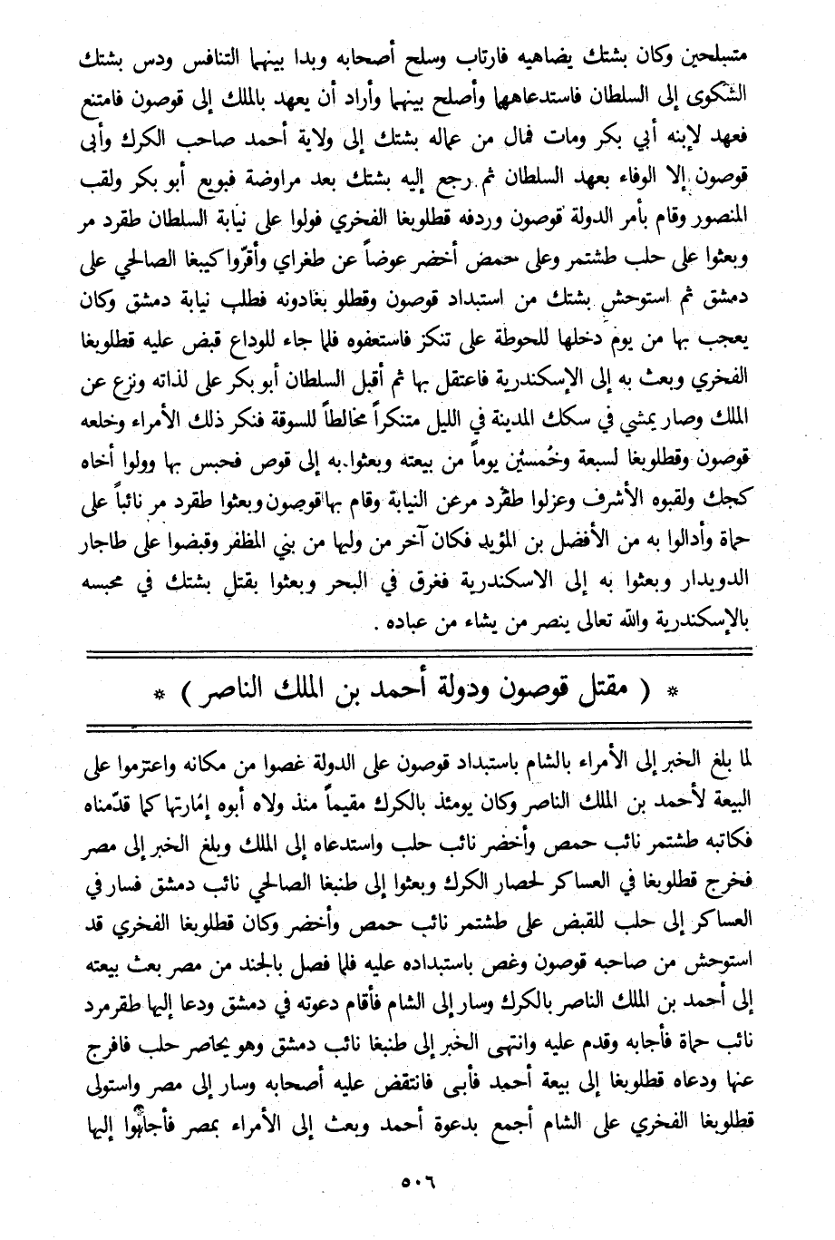 متسلحين وكان بشتك يضاهيه فارتاب وسلح أصحابه وبدا بينهما التنافس ودس بشتك الشكوى إلى السلطان فاستدعاهما وأصلح بينهما وأراد أن يعهد بالملك إلى قوصون فامتنع فعهد لابنه أبي بكر ومات فمال من عماله بشتك إلى ولاية أحمد صاحب الكرك وأبى قوصون إلا الوفاء بعهد السلطان ثم رجع إليه بشتك بعد مراوضة فبويع أبو بكر ولقب المنصور وقام بأمر الدولة قوصون وردفه قطلوبغا الفخري فولوا على نيابة السلطان طقردمر وبعثوا على حلب طشتمر وعلى حمص أخضر عوضا عن طغراي وأقرّوا كيبغا الصالحي على دمشق ثم استوحش بشتك من استبداد قوصون وقطلوبغا دونه فطلب نيابة دمشق وكان يعجب بها من يوم دخلها للحوطة على تنكز فاستعفوه فلما جاء للوداع قبض عليه قطلوبغا الفخري وبعث به إلى الإسكندرية فاعتقل بها ثم أقبل السلطان أبو بكر على لذاته ونزع عن الملك وصار يمشي في سكك المدينة في الليل متنكرا مخالطا للسوقة فنكر ذلك الأمراء وخلعه قوصون وقطلوبغا لسبعة وخمسين يوما من بيعته وبعثوا به إلى قوص فحبس بها وولوا أخاه كجك ولقبوه الأشرف وعزلوا طقردمر عن النيابة وقام بها قوصون وبعثوا طقردمر نائبا على حماة وأدالوا به من الأفضل بن المؤيد فكان آخر من وليها من بني المظفر وقبضوا على طاجار الدويدار وبعثوا به إلى الاسكندرية فغرق في البحر وبعثوا بقتل بشتك في محبسه بالإسكندرية والله تعالى ينصر من يشاء من عباده.