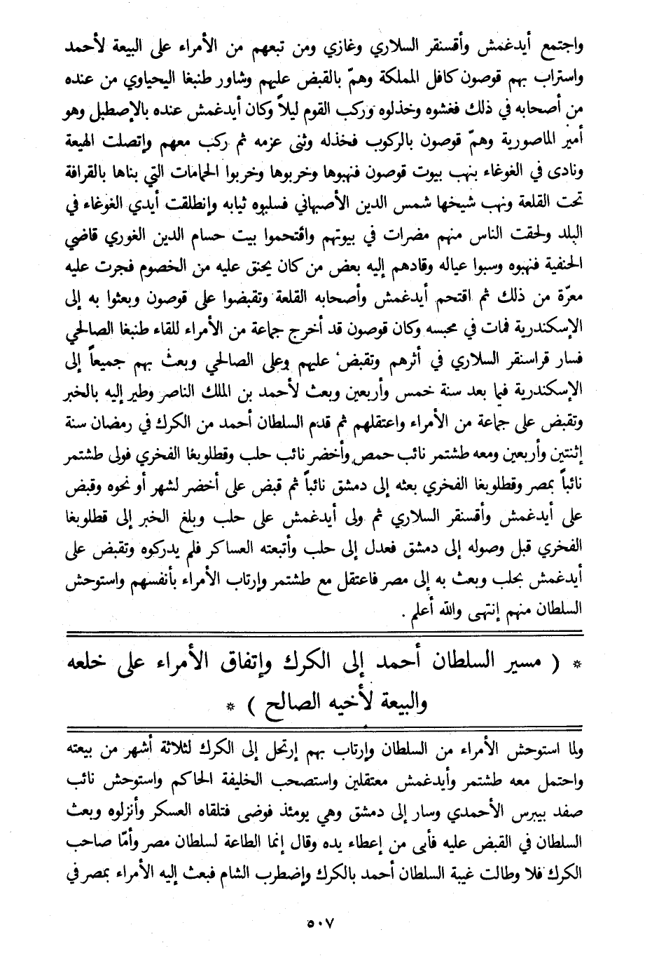 واجتمع آيدغمش وآق سنقر السلاري وغازي ومن تبعهم من الأمراء على البيعة لأحمد واستراب بهم قوصون كافل المملكة وهمّ بالقبض عليهم وشاور طنبغا اليحياوي من عنده من أصحابه في ذلك فغشوه وخذلوه وركب القوم ليلا وكان آيدغمش عنده بالإصطبل وهو أمير الماصورية وهمّ قوصون بالركوب فخذله وثنى عزمه ثم ركب معهم واتصلت الهيعة ونادى في الغوغاء بنهب بيوت قوصون فنهبوها وخربوها وخربوا الحمامات التي بناها بالقرافة تحت القلعة ونهب شيخها شمس الدين الأصبهاني فسلبوه ثيابه وانطلقت أيدي الغوغاء في البلد ولحقت الناس منهم مضرات في بيوتهم واقتحموا بيت حسام الدين الغوري قاضي الحنفية فنهبوه وسبوا عياله وقادهم إليه بعض من كان يحنق عليه من الخصوم فجرت عليه معرّة من ذلك ثم اقتحم آيدغمش وأصحابه القلعة وتقبضوا على قوصون وبعثوا به إلى الإسكندرية فمات في محبسه وكان قوصون قد أخرج جماعة من الأمراء للقاء طنبغا الصالحي فسار قراسنقر السلاري في أثرهم وتقبض عليهم وعلى الصالحي وبعث بهم جميعا إلى الإسكندرية فيما بعد سنة خمس وأربعين وبعث لأحمد بن الملك الناصر وطير إليه بالخبر وتقبض على جماعة من الأمراء واعتقلهم ثم قدم السلطان أحمد من الكرك في رمضان سنة اثنتين وأربعين ومعه طشتمر نائب حمص وأخضر نائب حلب وقطلوبغا الفخري فولى طشتمر نائبا بمصر وقطلوبغا الفخري بعثه إلى دمشق نائبا ثم قبض على أخضر لشهر أو نحوه وقبض على آيدغمش وآق سنقر السلاري ثم ولى آيدغمش على حلب وبلغ الخبر إلى قطلوبغا الفخري قبل وصوله إلى دمشق فعدل إلى حلب وأتبعته العساكر فلم يدركوه وتقبض على آيدغمش بحلب وبعث به إلى مصر فاعتقل مع طشتمر وارتاب الأمراء بأنفسهم واستوحش السلطان منهم انتهى والله أعلم.