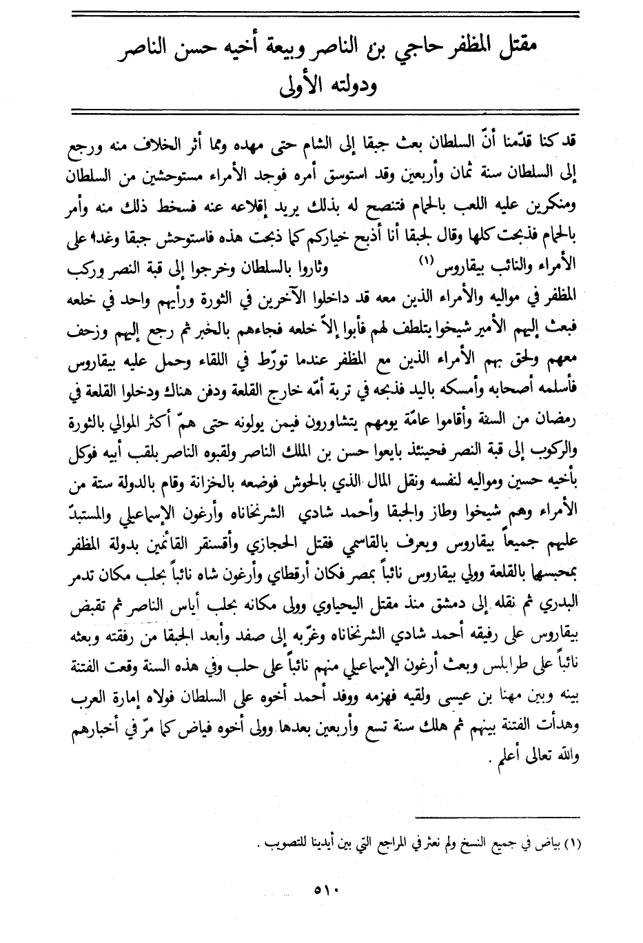 قد كنا قدّمنا أنّ السلطان بعث جبقا إلى الشام حتى مهده ومما أثر الخلاف منه ورجع إلى السلطان سنة ثمان وأربعين وقد استوسق أمره فوجد الأمراء مستوحشين من السلطان ومنكرين عليه اللعب بالحمام فتنصح له بذلك يريد إقلاعه عنه فسخط ذلك منه وأمر بالحمام فذبحت كلها وقال لجبقا أنا أذبح خياركم كما ذبحت هذه فاستوحش جبقا وغدا على الأمراء والنائب بيقاروس [1] وثاروا بالسلطان وخرجوا إلى قبة النصر وركب المظفر في مواليه والأمراء الذين معه قد داخلوا الآخرين في الثورة ورأيهم واحد في خلعه فبعث إليهم الأمير شيخو يتلطف لهم فأبوا إلّا خلعه فجاءهم بالخبر ثم رجع إليهم وزحف معهم ولحق بهم الأمراء الذين مع المظفر عند ما تورّط في اللقاء وحمل عليه بيقاروس فأسلمه أصحابه وأمسكه باليد فذبحه في تربة أمّه خارج القلعة ودفن هناك ودخلوا القلعة في رمضان من السنة وأقاموا عامّة يومهم يتشاورون فيمن يولونه حتى همّ أكثر الموالي بالثورة والركوب إلى قبة النصر فحينئذ بايعوا حسن بن الملك الناصر ولقبوه الناصر بلقب أبيه فوكل بأخيه حسين ومواليه لنفسه ونقل المال الّذي بالحوش فوضعه بالخزانة وقام بالدولة ستة من الأمراء وهم شيخو وطاز والجبقا وأحمد شادي الشرنخاناه وأرغون الإسماعيلي والمستبدّ عليهم جميعا بيقاروس ويعرف بالقاسمي فقتل الحجازي وآق سنقر القائمين بدولة المظفر بمحبسهما بالقلعة وولي بيقاروس نائبا بمصر فكان أرقطاي وأرغون شاه نائبا بحلب مكان تدمر البدري ثم نقله إلى دمشق منذ مقتل اليحياوي وولى مكانه بحلب إياس الناصر ثم تقبض بيقاروس على رفيقه أحمد شادي الشرنخاناه وغرّبه إلى صفد وأبعد الجبقا من رفقته وبعثه نائبا على طرابلس وبعث أرغون الإسماعيلي منهم نائبا على حلب وفي هذه السنة وقعت الفتنة بينه وبين مهنا بن عيسى ولقيه فهزمه ووفد أحمد أخوه على السلطان فولاه إمارة العرب وهدأت الفتنة بينهم ثم هلك سنة تسع وأربعين بعدها وولى أخوه فياض كما مرّ في أخبارهم والله تعالى أعلم.