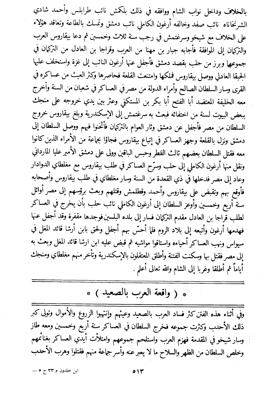 بالخلاف وداخل نواب الشام ووافقه في ذلك بلكمش نائب طرابلس وأحمد شادي الشرنخاناه نائب صفد وخالفه أرغون الكاملي نائب دمشق وتمسك بالطاعة وتعاقد هؤلاء على الخلاف مع شيخو وسرغتمش في رجب سنة ثلاث وخمسين ثم دعا بيقاروس العرب والتركمان إلى الموافقة فأجابه جبار بن مهنا من العرب وقراجا بن العادل من التركمان في جموعهما وبرز من حلب بقصد دمشق فأجفل عنها أرغون النائب إلى غزة واستخلف عليها الجبقا العادلي ووصل بيقاروس فملكها وامتنعت القلعة فحاصرها وكثر العيث من عساكره في القرى وسار السلطان الصالح وأمراء الدولة من مصر في العساكر في شعبان من السنة وأخرج معه الخليفة المعتضد أبا الفتح أبا بكر بن المستكفي وعثر بين يدي خروجه على منجك ببعض البيوت لسنة من اختفائه فبعث به سرغتمش إلى الإسكندرية وبلغ بيقاروس خروج السلطان من مصر فأجفل عن دمشق وثار العوام بالتركمان فأثخنوا فيهم ووصل السلطان إلى دمشق ونزل بالقلعة وجهز العساكر في إتباع بيقاروس فجاءوا بجماعة من الأمراء الذين كانوا معه فقتل السلطان بعضهم ثالث الفطر وحبس الباقين وولى على دمشق الأمير عليا المارداني ونقل منها أرغون الكاملي إلى حلب وسرّح العساكر في طلب بيقاروس مع مغلطاي الدوادار وعاد إلى مصر فدخلها في ذي القعدة من السنة وسار مغلطاي في طلب بيقاروس وأصحابه فأوقع بهم وتقبض على بيقاروس وأحمد وقطلمش وقتلهم وبعث برءوسهم إلى مصر أوائل سنة أربع وخمسين وأوعز السلطان إلى أرغون الكاملي نائب حلب بأن يخرج في العساكر لطلب قراجا بن العادل مقدم التركمان فسار إلى بلده البلسين فوجدها مقفرة وقد أجفل عنها فهدمها أرغون وأتبعه إلى بلاد الروم فلما أحسّ بهم أجفل ولحق بابن أرشا قائد المغل في سيواس ونهب العساكر أحياءه واستاقوا مواشيه ثم قبض عليه ابن ارشا قائد المغل وبعث به إلى مصر فقتل بها وسكنت الفتنة وأطلق المعتقلون بالإسكندرية وتأخر منهم مغلطاي ومنجك أياما ثم أطلقا وغربا إلى الشام والله تعالى أعلم.