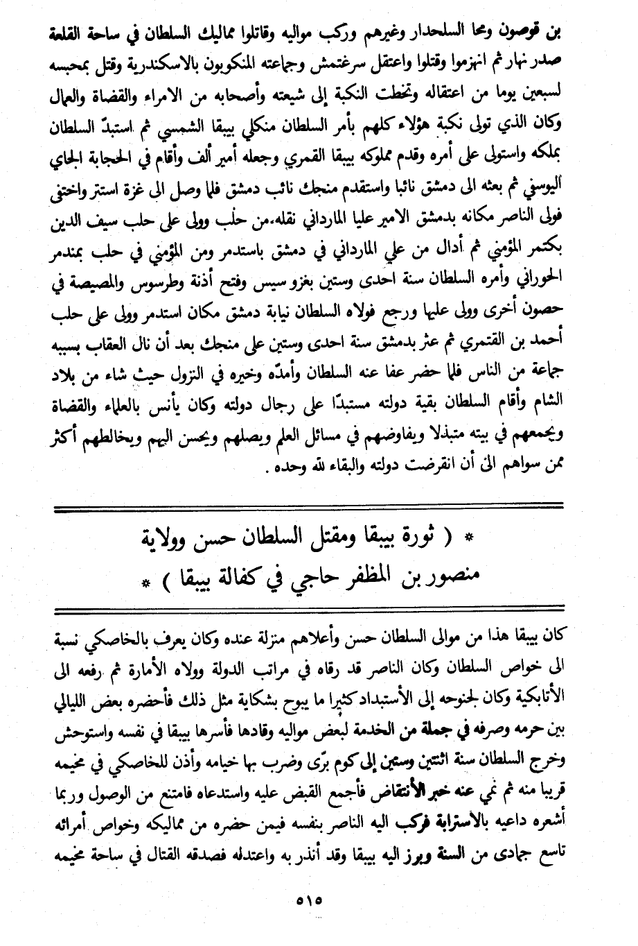 بن قوصون ومحا السلحدار وغيرهم وركب مواليه وقاتلوا مماليك السلطان في ساحة القلعة صدر نهار ثم انهزموا وقتلوا واعتقل سرغتمش وجماعته المنكوبون بالإسكندرية وقتل بمحبسه لسبعين يوما من اعتقاله وتخطت النكبة إلى شيعته وأصحابه من الأمراء والقضاة والعمال وكان الّذي تولى نكبة هؤلاء كلهم بأمر السلطان منكلي بيبقا الشمسي ثم استبدّ السلطان بملكه واستولى على أمره وقدم مملوكه بيبقا القمري وجعله أمير ألف وأقام في الحجابة الجاي اليوسفي ثم بعثه الى دمشق نائبا واستقدم منجك نائب دمشق فلما وصل الى غزة استتر واختفى فولى الناصر مكانه بدمشق الأمير عليا المارداني نقله من حلب وولى على حلب سيف الدين بكتمر المؤمني ثم أدال من علي المارداني في دمشق باستدمر ومن المؤمني في حلب بمندمر الحوراني وأمره السلطان سنة احدى وستين بغزو سيس وفتح أذنة وطرسوس والمصيصة في حصون أخرى وولى عليها ورجع فولاه السلطان نيابة دمشق مكان استدمر وولى على حلب أحمد بن القتمري ثم عثر بدمشق سنة احدى وستين على منجك بعد أن نال العقاب بسببه جماعة من الناس فلما حضر عفا عنه السلطان وأمدّه وخيره في النزول حيث شاء من بلاد الشام وأقام السلطان بقية دولته مستبدّا على رجال دولته وكان يأنس بالعلماء والقضاة ويجمعهم في بيته متبذلا ويفاوضهم في مسائل العلم ويصلهم ويحسن اليهم ويخالطهم أكثر ممن سواهم الى أن انقرضت دولته والبقاء للَّه وحده.