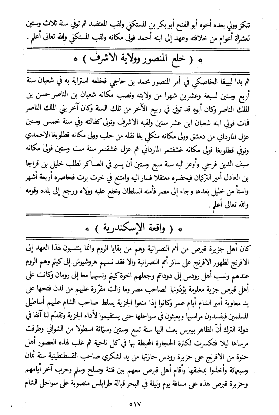 كان أهل جزيرة قبرص من أمم النصرانية وهم من بقايا الروم وانما ينتسبون لهذا العهد إلى الافرنج لظهور الافرنج على سائر أمم النصرانية والا فقد نسبهم هروشيوش إلى كيتم وهم الروم عندهم ونسب أهل رودس إلى دوداتم وجعلهم اخوة كيتم ونسبهما معا إلى رومان وكانت على أهل قبرص جزية معلومة يؤدّونها لصاحب مصر وما زالت مقرّرة عليهم من لدن فتحها على يد معاوية أمير الشام أيام عمر وكانوا إذا منعوا الجزية يسلط صاحب الشام عليهم أساطيل المسلمين فيفسدون مراسيها ويعيثون في سواحلها حتى يستقيموا لأداء الجزية وتقدّم لنا آنفا في دولة الترك أنّ الظاهر بيبرس بعث اليها سنة تسع وستين وستمائة اسطولا من الشواني وطرقت مرساها ليلا فتكسرت لكثرة الحجارة المحيطة بها في كل ناحية ثم غلب لهذه العصور أهل جنوة من الافرنج على جزيرة رودس حازتها من يد لشكري صاحب القسطنطينية سنة ثمان وسبعمائة وأخذوا بمخنقها وأقام أهل قبرص معهم بين فتنة وصلح وسلم وحرب آخر أيامهم وجزيرة قبرص هذه على مسافة يوم وليلة في البحر قبالة طرابلس منصوبة على سواحل الشام