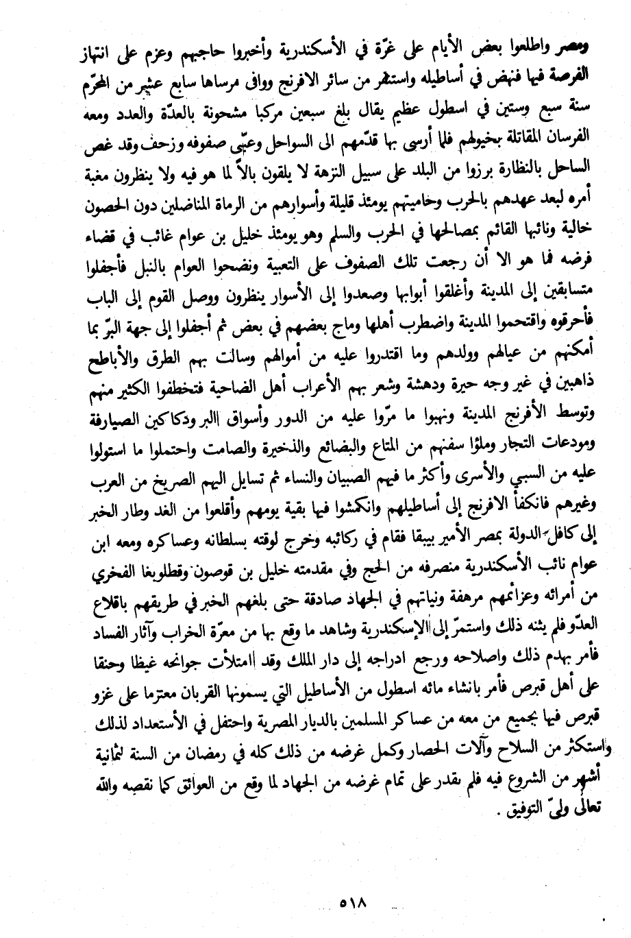 ومصر واطلعوا بعض الأيام على غرّة في الإسكندرية وأخبروا حاجبهم وعزم على انتهاز الفرصة فيها فنهض في أساطيله واستنقر من سائر الافرنج ووافى مرساها سابع عشر من المحرّم سنة سبع وستين في اسطول عظيم يقال بلغ سبعين مركبا مشحونة بالعدّة والعدد ومعه الفرسان المقاتلة بخيولهم فلما أرسى بها قدّمهم الى السواحل وعبّى صفوفه وزحف وقد غص الساحل بالنظارة برزوا من البلد على سبيل النزهة لا يلقون بالا لما هو فيه ولا ينظرون مغبة أمره لبعد عهدهم بالحرب وحاميتهم يومئذ قليلة وأسوارهم من الرماة المناضلين دون الحصون خالية ونائبها القائم بمصالحها في الحرب والسلم وهو يومئذ خليل بن عوام غائب في قضاء فرضه فما هو الا أن رجعت تلك الصفوف على التعبية ونضحوا العوام بالنبل فأجفلوا متسابقين إلى المدينة وأغلقوا أبوابها وصعدوا إلى الأسوار ينظرون ووصل القوم إلى الباب فأحرقوه واقتحموا المدينة واضطرب أهلها وماج بعضهم في بعض ثم أجفلوا إلى جهة البرّ بما أمكنهم من عيالهم وولدهم وما اقتدروا عليه من أموالهم وسالت بهم الطرق والأباطح ذاهبين في غير وجه حيرة ودهشة وشعر بهم الأعراب أهل الضاحية فتخطفوا الكثير منهم وتوسط الأفرنج المدينة ونهبوا ما مرّوا عليه من الدور وأسواق البر ودكاكين الصيارفة ومودعات التجار وملئوا سفنهم من المتاع والبضائع والذخيرة والصامت واحتملوا ما استولوا عليه من السبي والأسرى وأكثر ما فيهم الصبيان والنساء ثم تسايل اليهم الصريخ من العرب وغيرهم فانكفأ الافرنج إلى أساطيلهم وانكمشوا فيها بقية يومهم وأقلعوا من الغد وطار الخبر إلى كافل الدولة بمصر الأمير بيبقا فقام في ركائبه وخرج لوقته بسلطانه وعساكره ومعه ابن عوام نائب الإسكندرية منصرفه من الحج وفي مقدمته خليل بن قوصون وقطلوبغا الفخري من أمرائه وعزائمهم مرهفة ونياتهم في الجهاد صادقة حتى بلغهم الخبر في طريقهم باقلاع العدوّ فلم يثنه ذلك واستمرّ إلى الإسكندرية وشاهد ما وقع بها من معرّة الخراب وآثار الفساد فأمر بهدم ذلك وإصلاحه ورجع ادراجه إلى دار الملك وقد امتلأت جوانحه غيظا وحنقا على أهل قبرص فأمر بإنشاء مائه اسطول من الأساطيل التي يسمونها القربان معتزما على غزو قبرص فيها بجميع من معه من عساكر المسلمين بالديار المصرية واحتفل في الاستعداد لذلك واستكثر من السلاح وآلات الحصار وكمل غرضه من ذلك كله في رمضان من السنة لثمانية أشهر من الشروع فيه فلم بقدر على تمام غرضه من الجهاد لما وقع من العوائق كما نقصه والله تعالى ولىّ التوفيق
